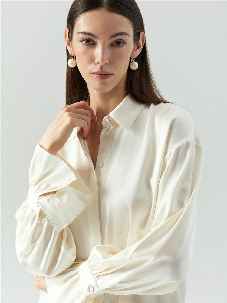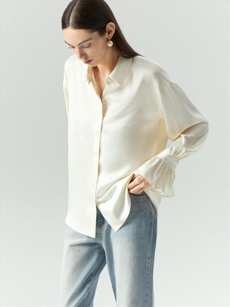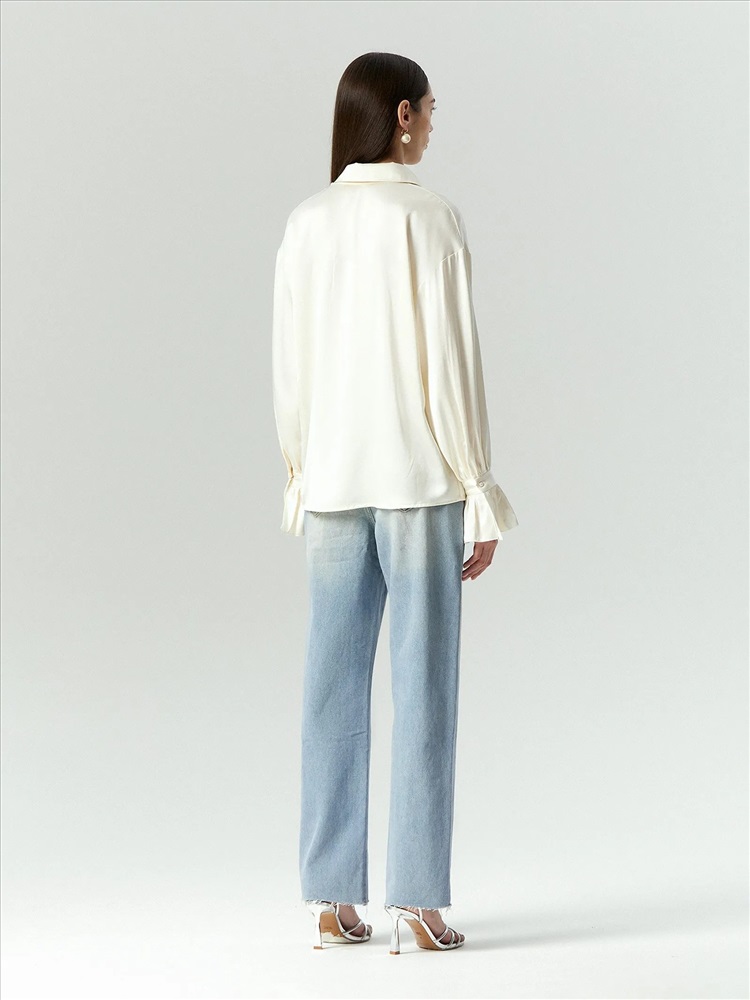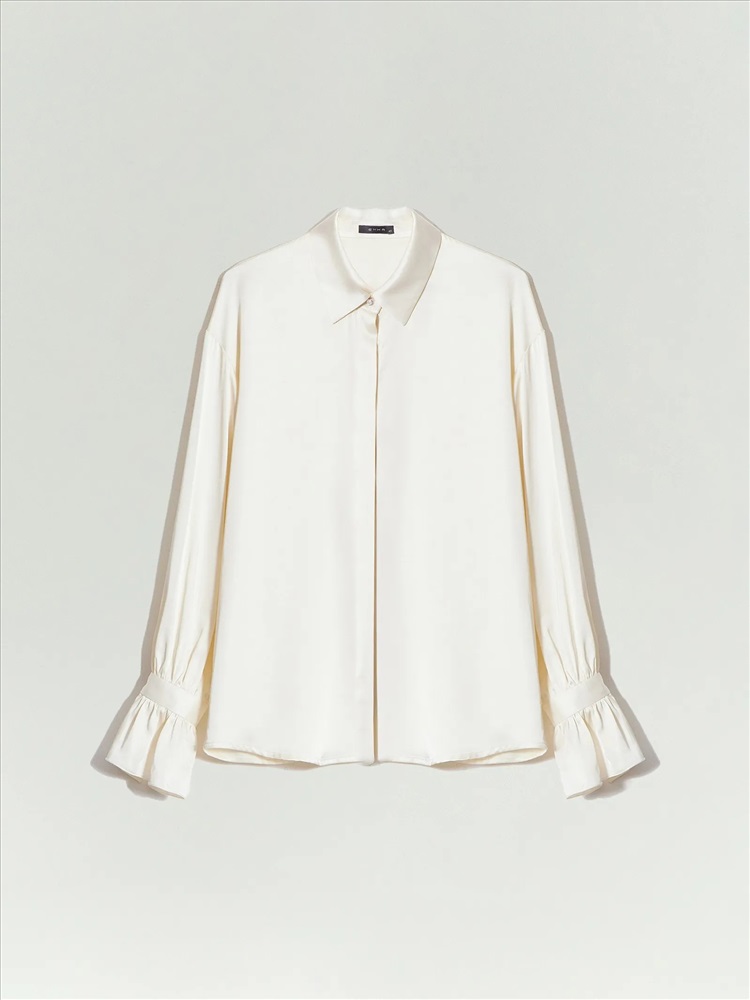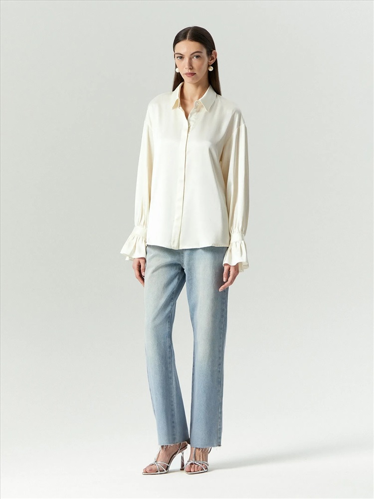 Нежная атласная блуза сливочного цвета радует глаз и приятна к телу. Она станет одной из любимых вещей в гардеробе. Её отличает романтичный фасон с оборками на рукавах и элегантной планкой, скрывающей пуговицы. Под отлётами воротника и на манжетах — изящные пуговицы-жемчужинки. Рубашка сделает женственнее образы с денимом или костюмными брюками, идеально дополнит юбки в бельевом стиле.