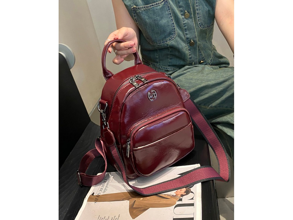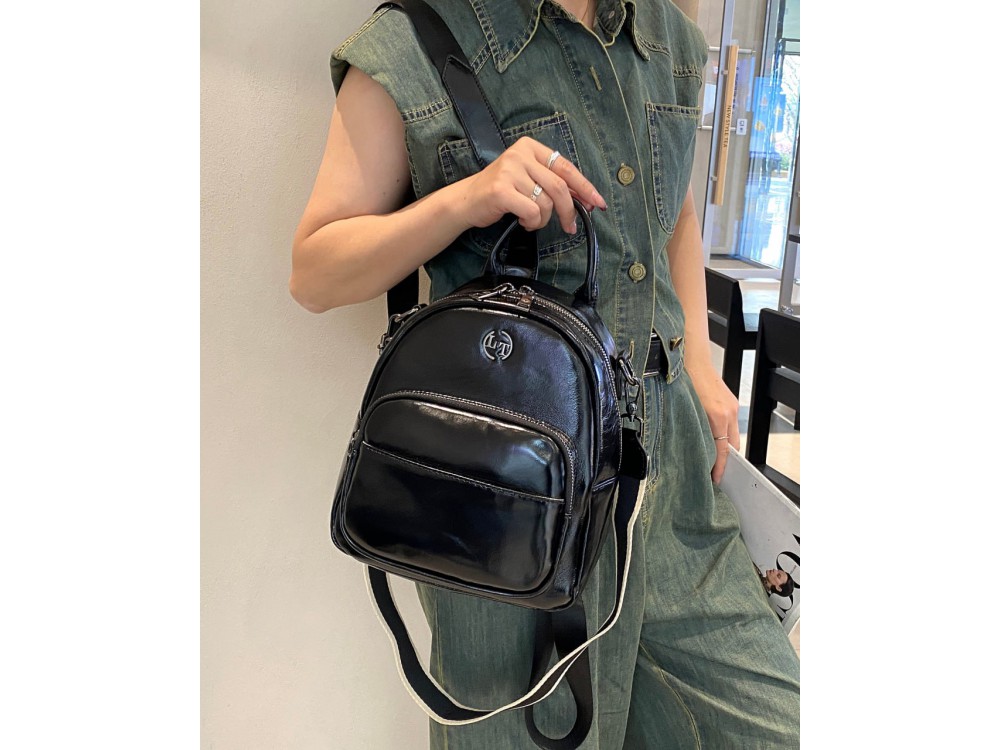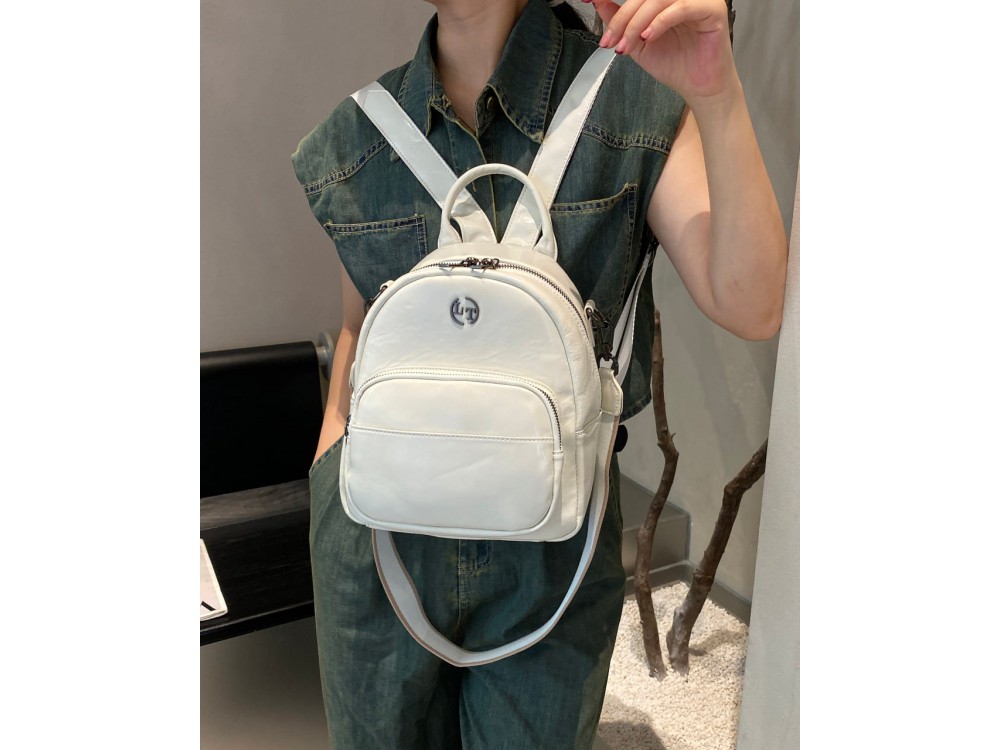 Лямки рюкзака с возможностью регулировки. Два основных отделения на молнии. Внутри: два кармана для аксессуаров один из которых на молнии. Снаружи: спереди вместительных отдел для мелочей на молнии. Сзади: маленький кармашек для мелочи.