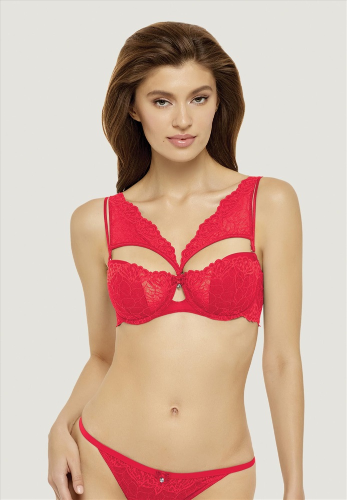Бюстгальтер-балконет с полудублированной поролоновой чашкой на каркасной поддержке. Стан из эластичного кружева на подкладке. Съемные декорированные бретели. Дополнительный комплект бретелей - спагетти. Декор - бантик с кристаллом.