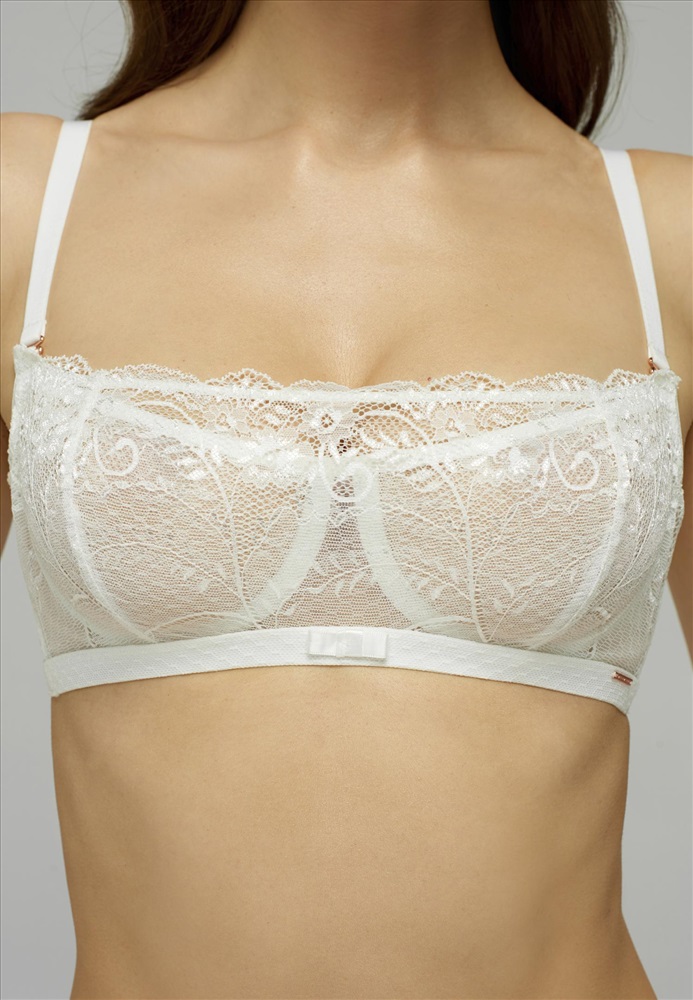 Бюстгальтер-балконет с мягкой чашкой на каркасной поддержке. Кружевная отделка чашек с эффектом «скрытого каркаса». Боковые детали с поддерживающими косточками. Съемные бретели.
