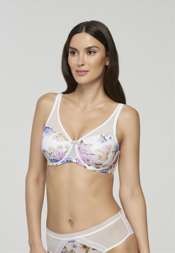 Бюстгальтер с формованной чашкой на каркасной поддержке. Эластичная сетка по линии декольте оригинальной V-образной формы. Стан из двойной сетки. Круглая спинка. Боковые детали с поддерживающими косточками украшены тесьмой. Модель прекрасно подойдет облад