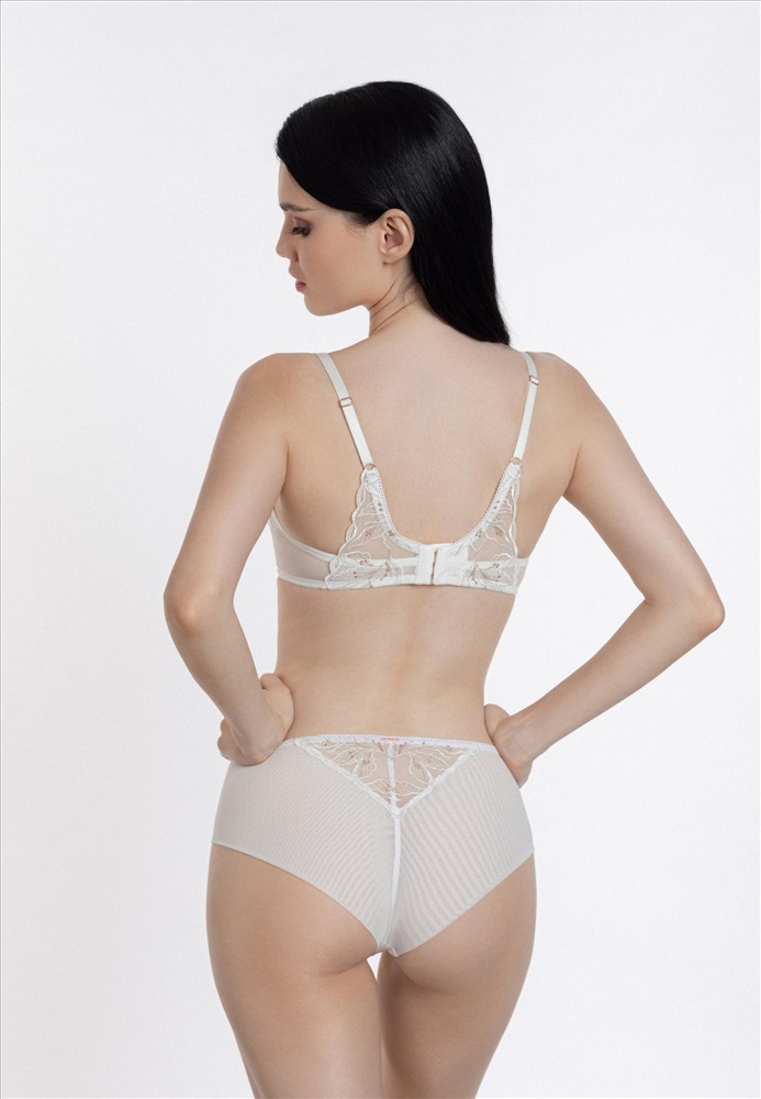 Трусы-бразилиана со средней линией талии. Передняя деталь: сочетание жаккарда и вышивки на сетке. Задняя деталь: двойная сетка в подворот.