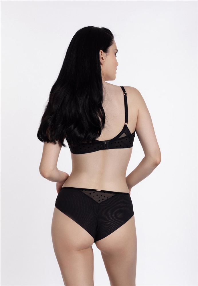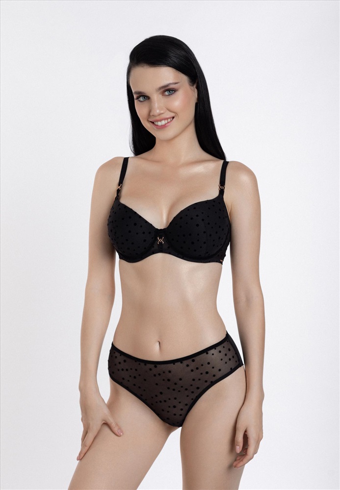 Бюстгальтер на каркасной поддержке с формованной чашкой и съемным кор-ректором «пуш-ап». Перекрест деталей из мягкой однотонной сетки и сетки с «flock-dots» на боковой панели.
