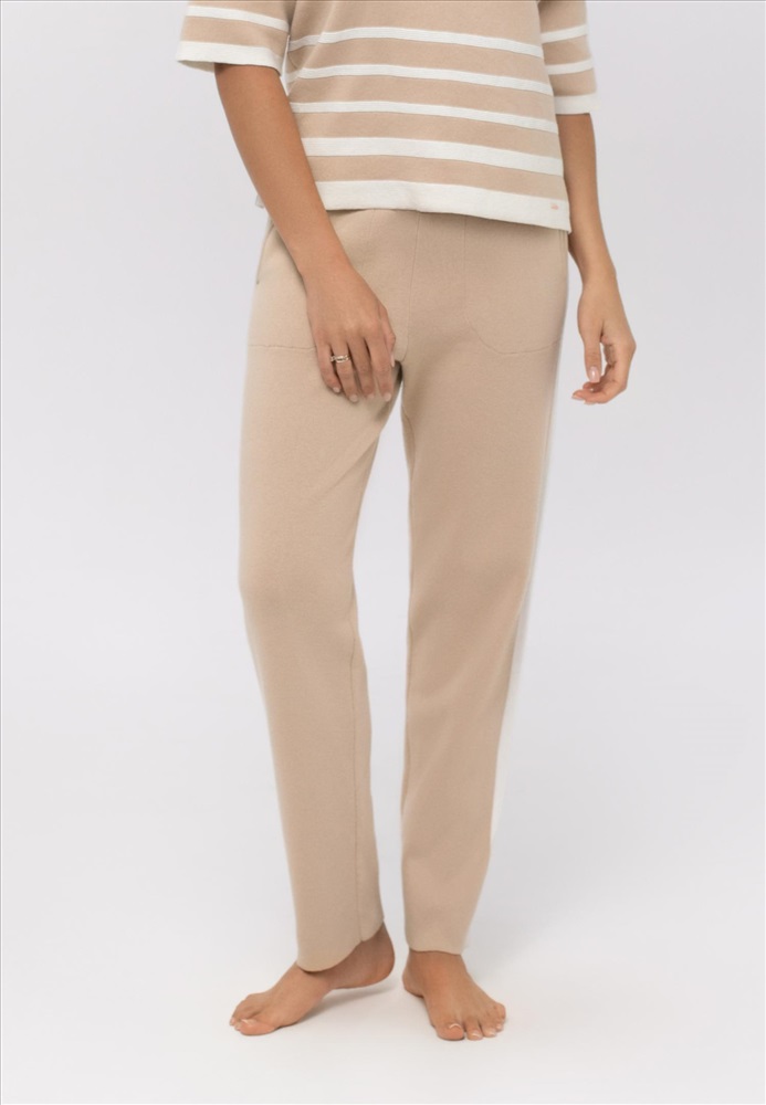 Брюки , слегка зауженные книзу. Пояс на резинке со шнуром. Боковые карманы. По бокам отделка контрастной полосой. Низ изделия выполнен по технике бесшовного края, без отстрочки.