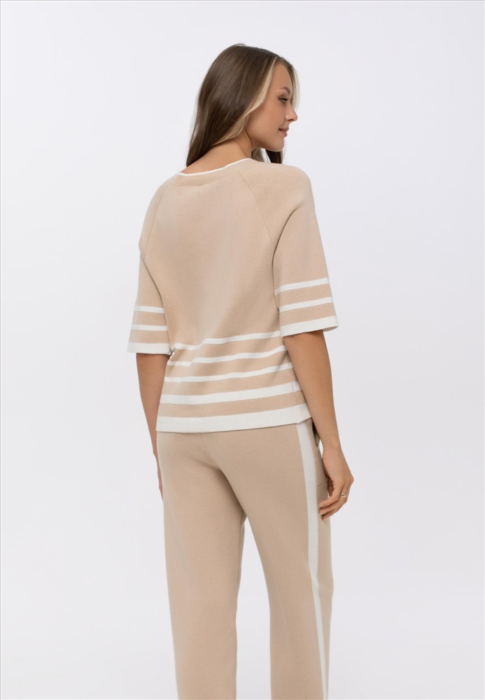 Джемпер с круглым вырезом горловины из трикотажа интерлок. Длина до середины бедра. Рукав реглан длиной 3/4. Контрастная отделка по нижнему краю рукавов, по низу изделия и горловине. Нижний край рукавов и изделия выполнены по технике бесшовного края, без отстрочки.