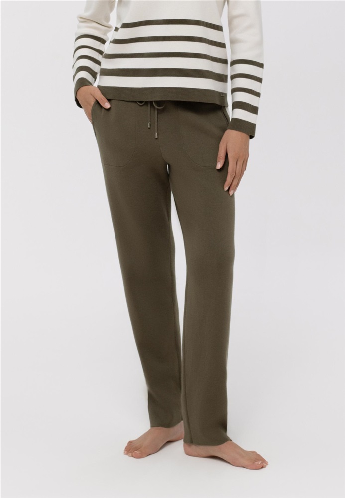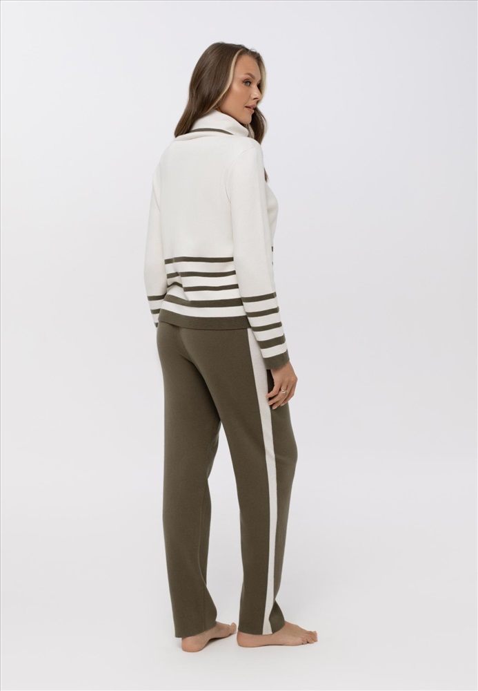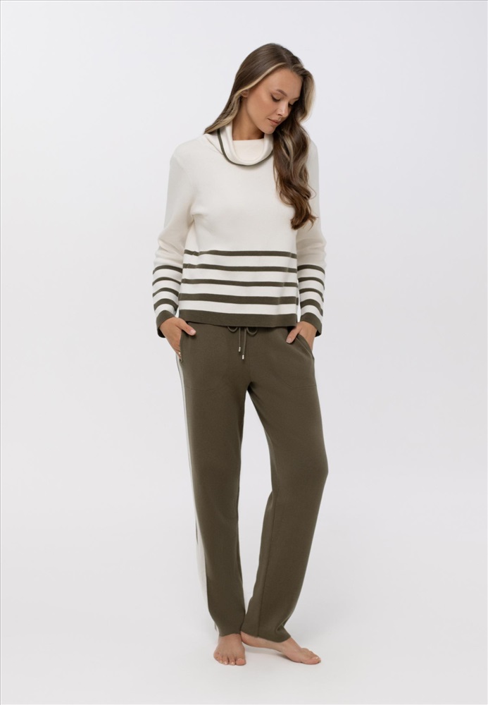 Брюки , слегка зауженные книзу. Пояс на резинке со шнуром. Боковые карманы. По бокам отделка контрастной полосой. Низ изделия выполнен по технике бесшовного края, без отстрочки.