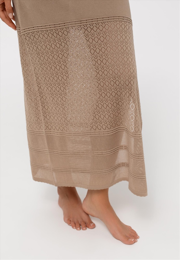 Длинное платье прямого силуэта без рукавов. Круглый вырез горловины. Верх и низ платья декорирован ажурными полосами. Полупрозрачный узор по линии талии и кант в тон подчеркивают фигуру. Разрезы по бокам.