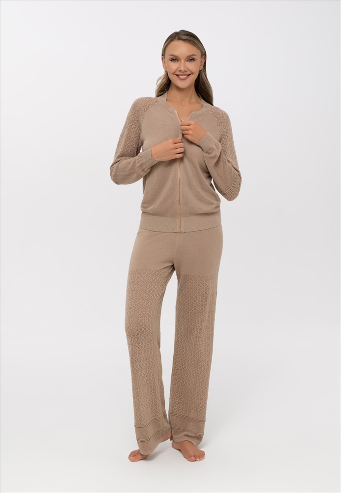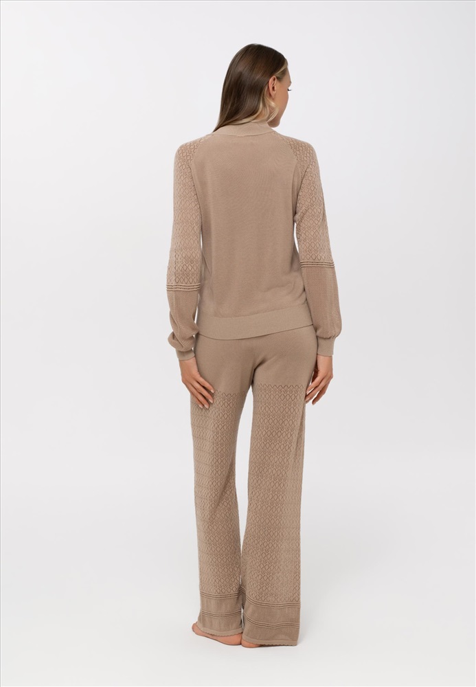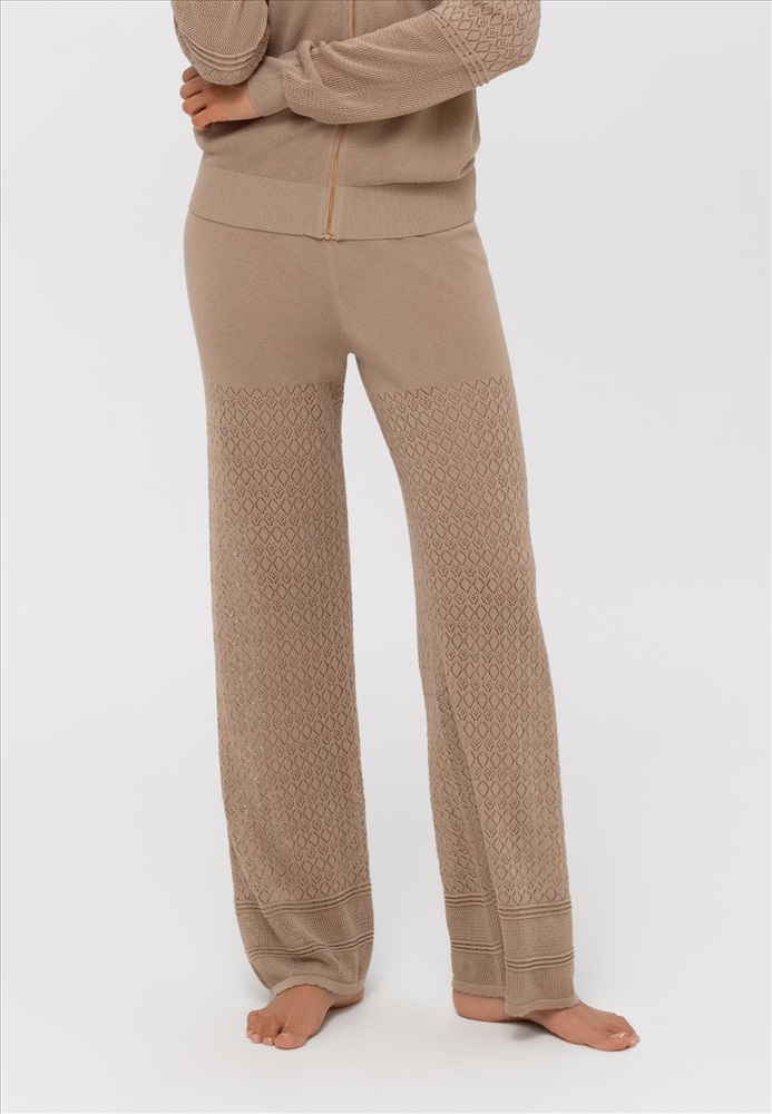 Брюки свободного прямого кроя. Верхняя часть из гладкого трикотажа, ниже от бедра ажурный трикотаж оригинальной вязки. Пояс выполнен из вязанной резинки. На поясе и по низу брюк декоративная окантовка.