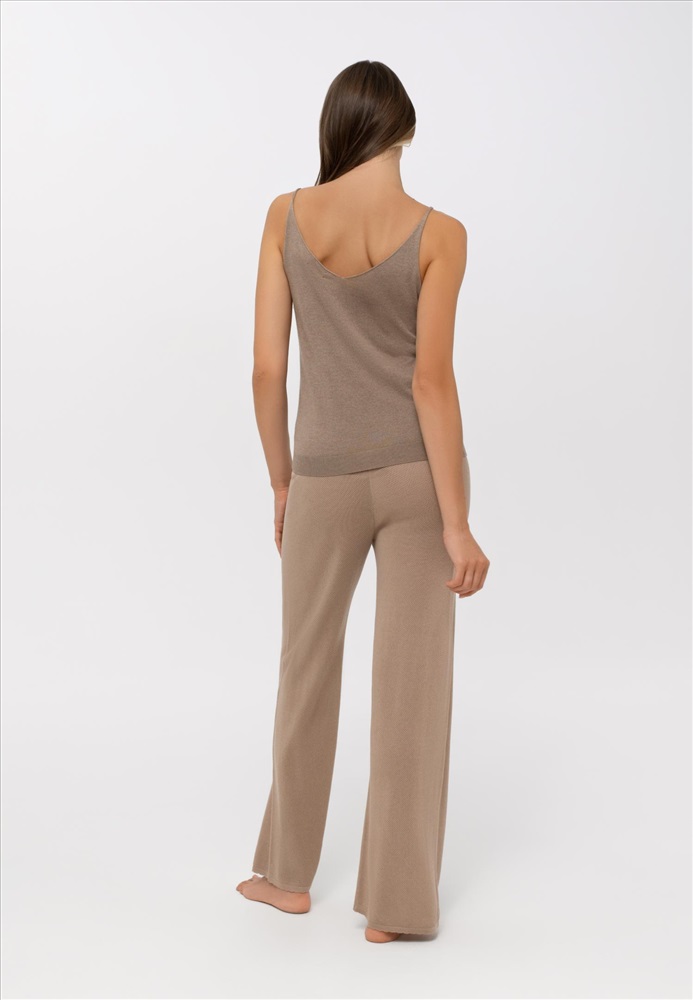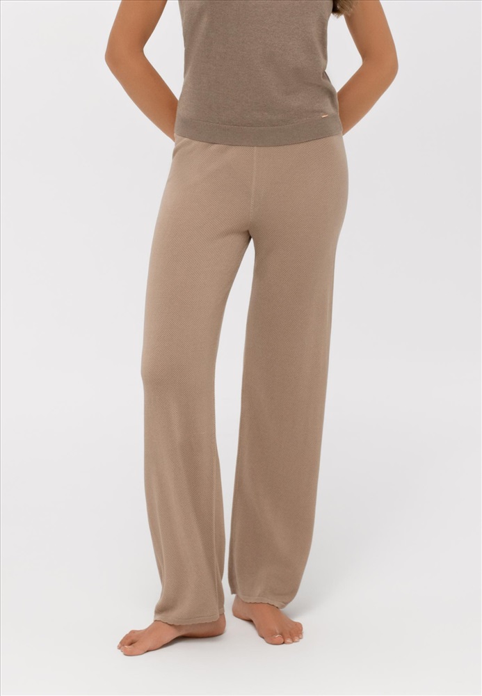 Брюки свободного прямого кроя. Пояс выполнен из вязанной резинки. На поясе декоративная окантовка.