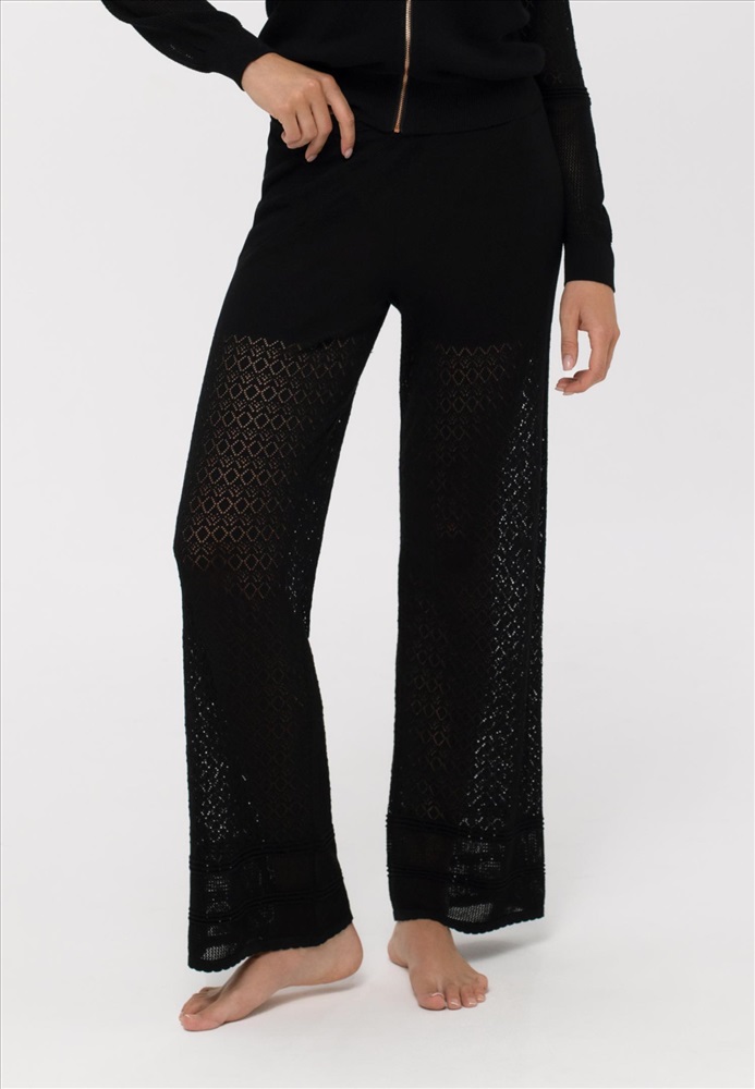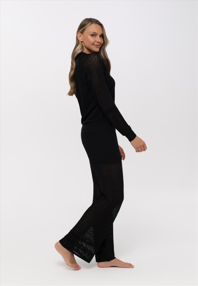 Брюки свободного прямого кроя. Верхняя часть из гладкого трикотажа, ниже от бедра ажурный трикотаж оригинальной вязки. Пояс выполнен из вязанной резинки. На поясе и по низу брюк декоративная окантовка.