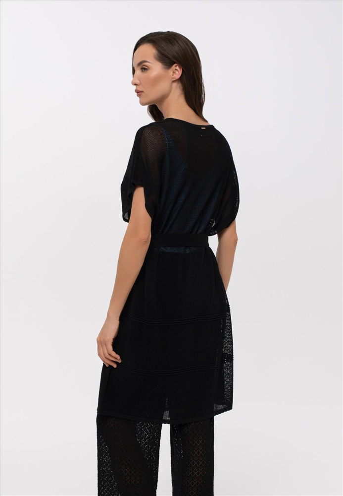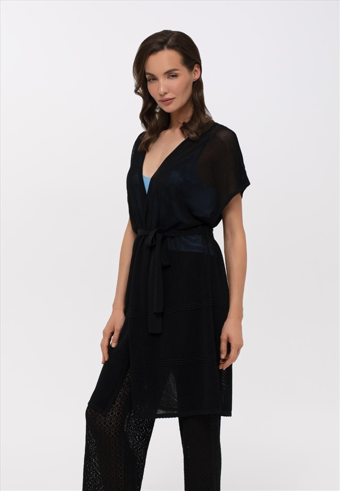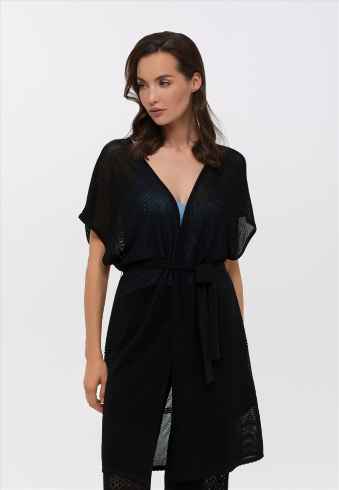 Летний кардиган со спущенным плечом свободного прямого кроя из мягкого шелка и лиоцелла. Ажурное трикотажное полотно с фактурными кантами. Пояс в комплекте. Длина до середины бедра.