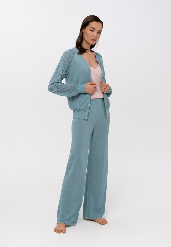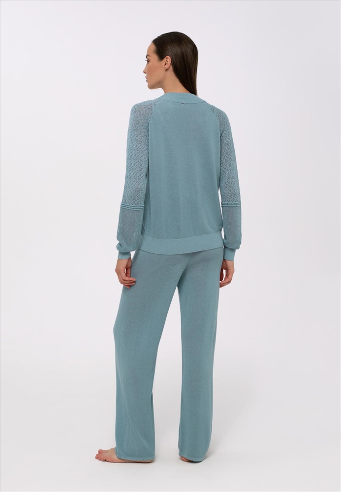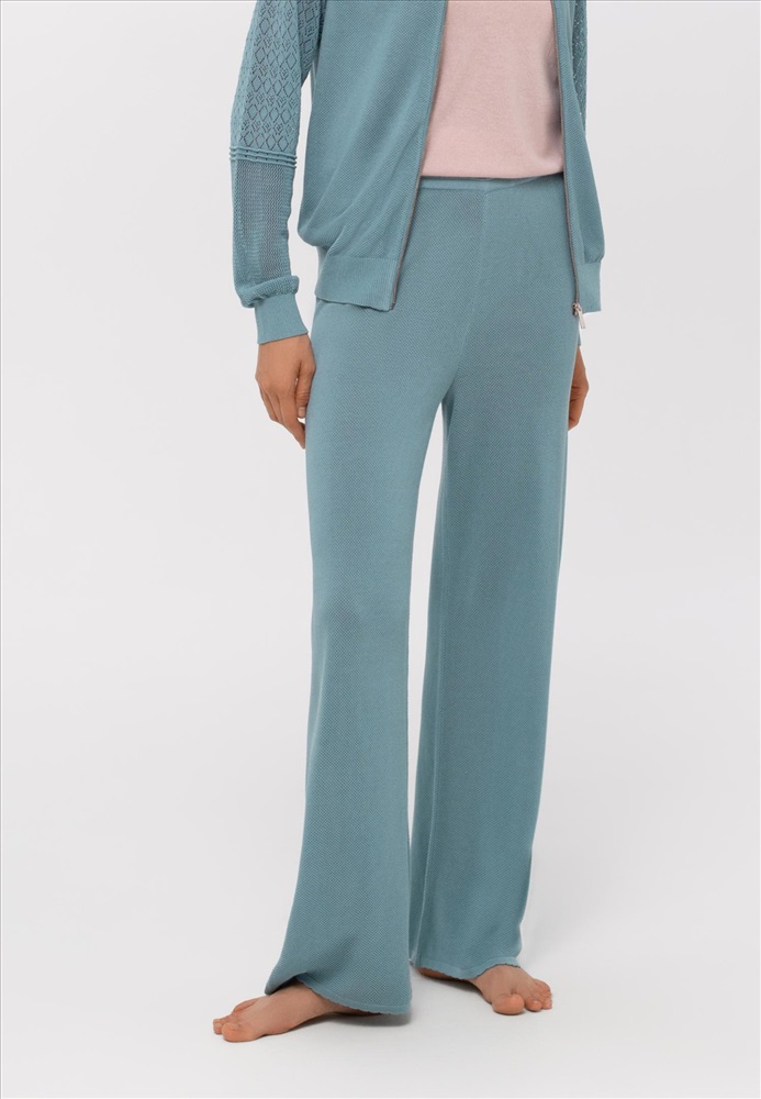 Брюки свободного прямого кроя. Пояс выполнен из вязанной резинки. На поясе декоративная окантовка.