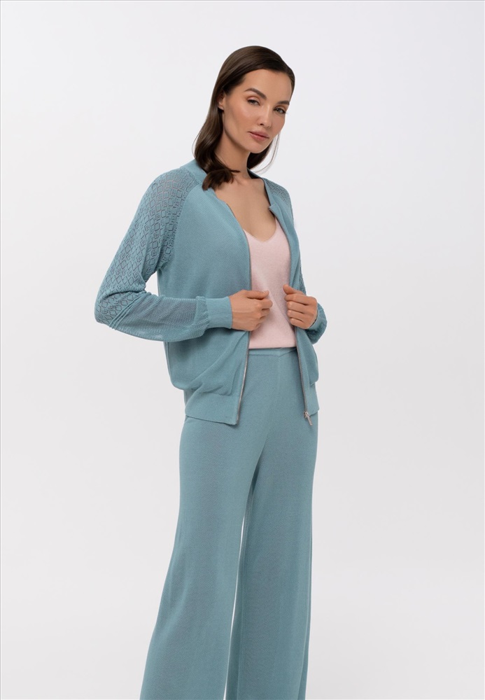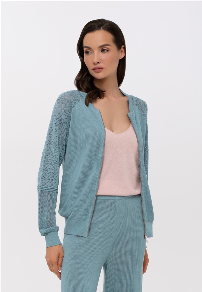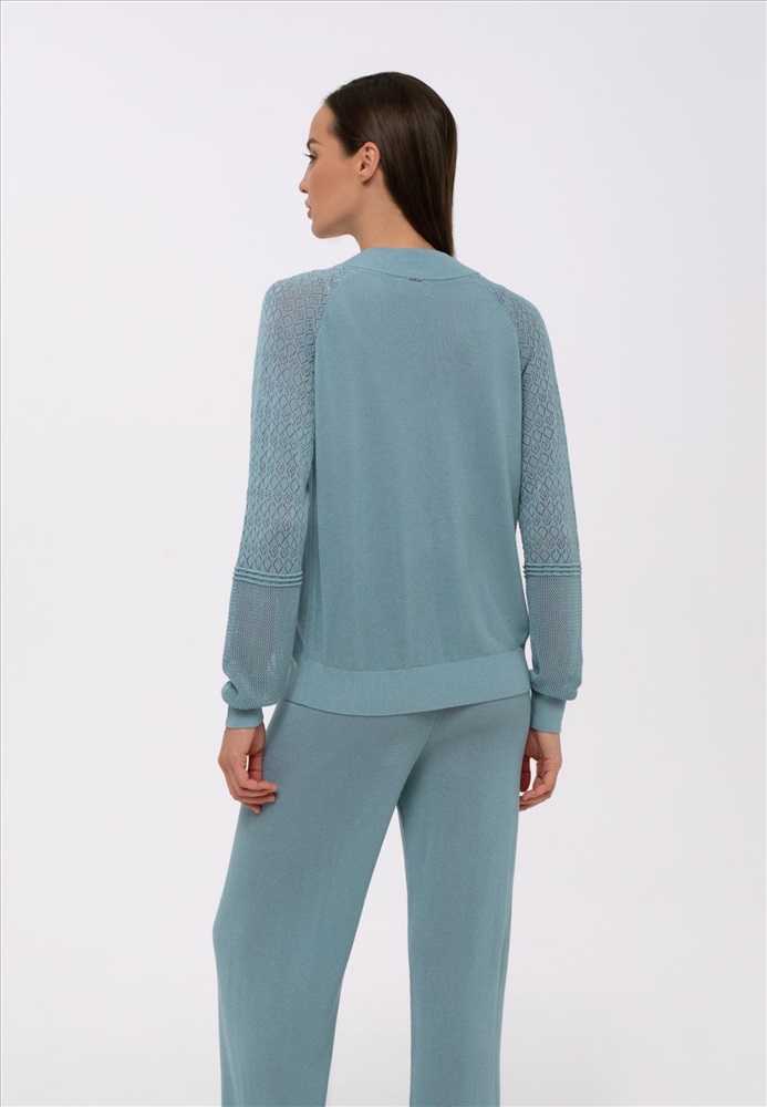 Легкий джемпер на молнии из ажурного трикотажа. Длина до линии бедер. Воротник-стойка. Рукав реглан с ажурной вязкой в верхней части. Манжеты и пояс по низу изделия вывязаны резинкой с фактурным кантом. Оригинальная текстура трикотажного полотна.