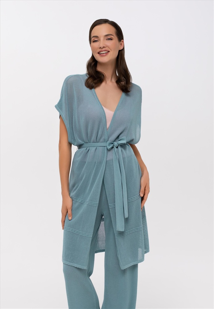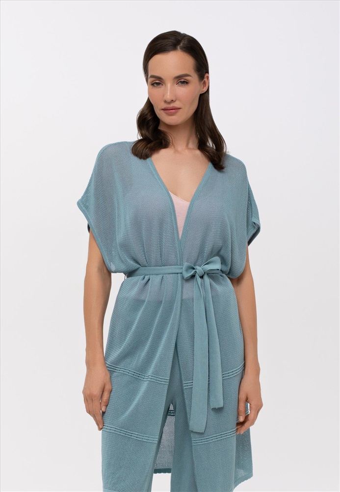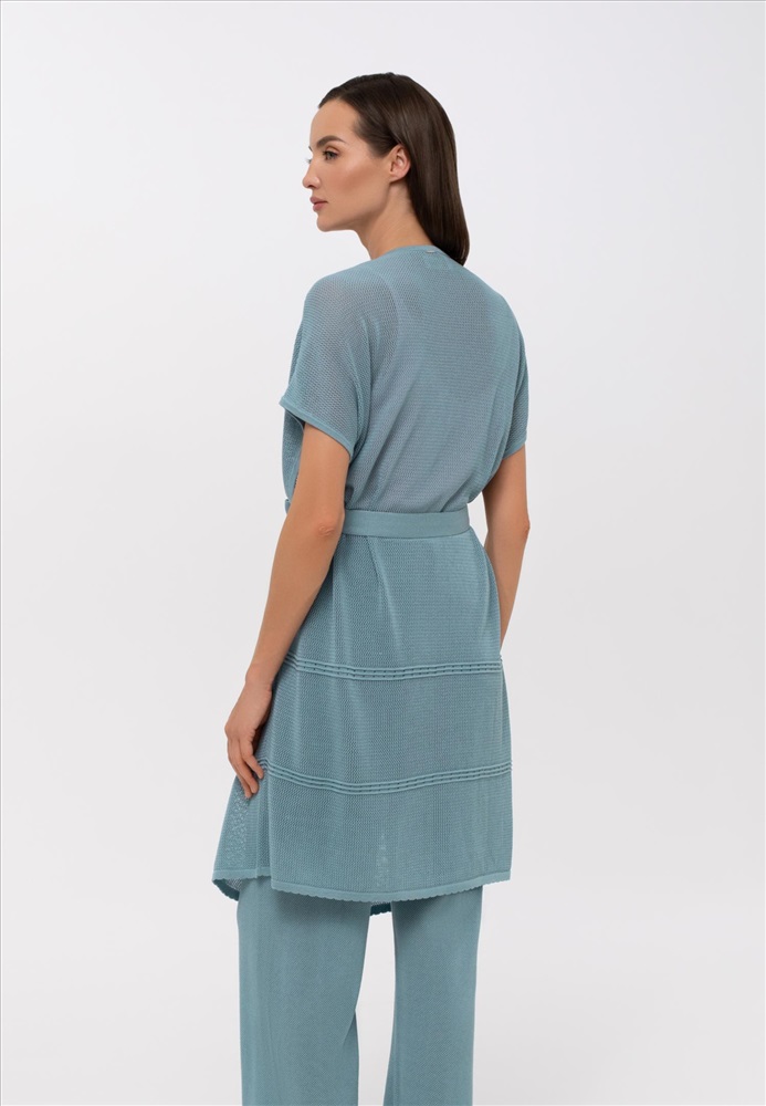 Летний кардиган со спущенным плечом свободного прямого кроя из мягкого шелка и лиоцелла. Ажурное трикотажное полотно с фактурными кантами. Пояс в комплекте. Длина до середины бедра.