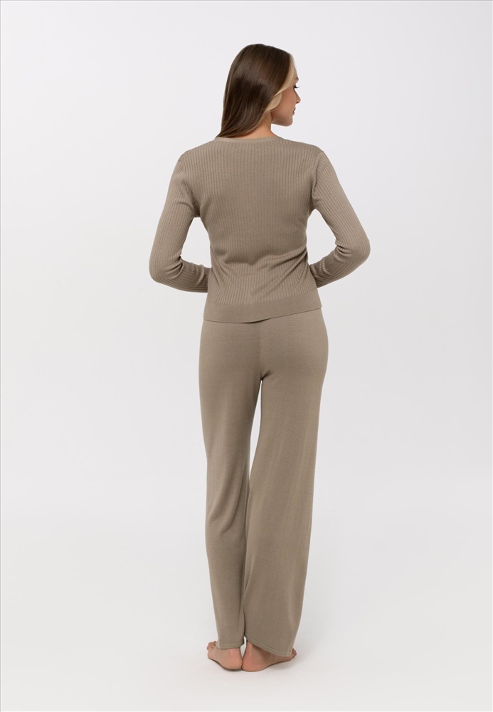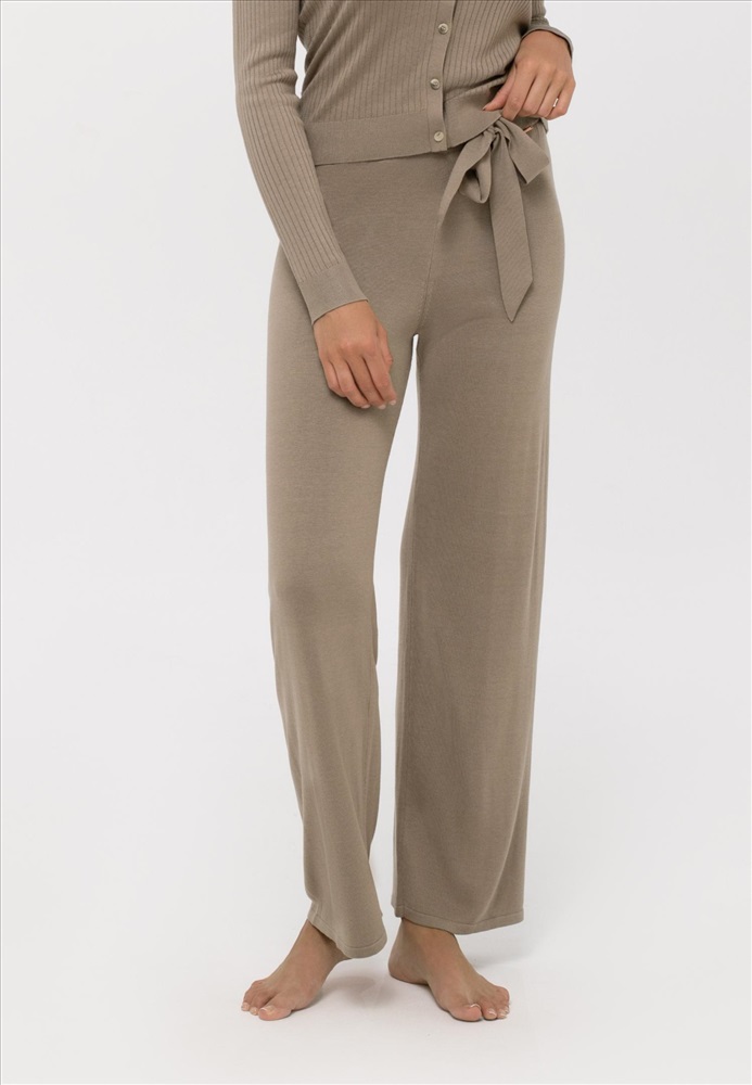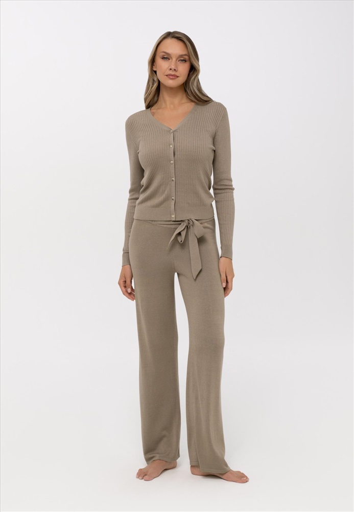 Брюки свободного прямого кроя. Пояс выполнен вязаной резинкой с широкими завязками из гладкого трикотажа.