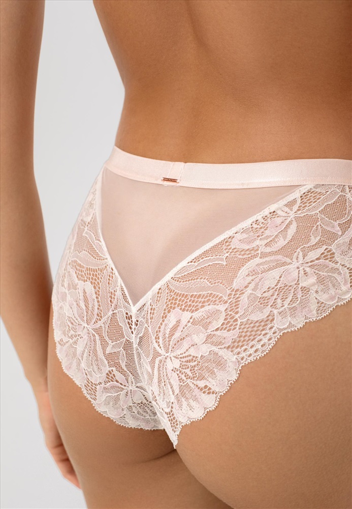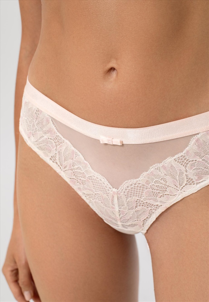 Трусы-бразилиана со средней линией талии. Пояс выполнен из широкой эластичной тесьмы. Передняя деталь из кружева на подкладке из сетки. Задняя деталь – сочетание сетки и кружева с ажурными краями.