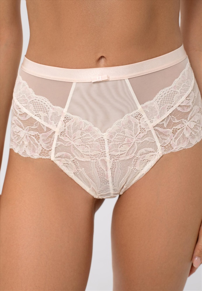 Трусы-бразилиана с завышенной линией талии. Пояс выполнен из широкой эластичной тесьмы. Передняя деталь из кружева на подкладке из сетки. Задняя деталь из кружева и двойной сетки в подворот.