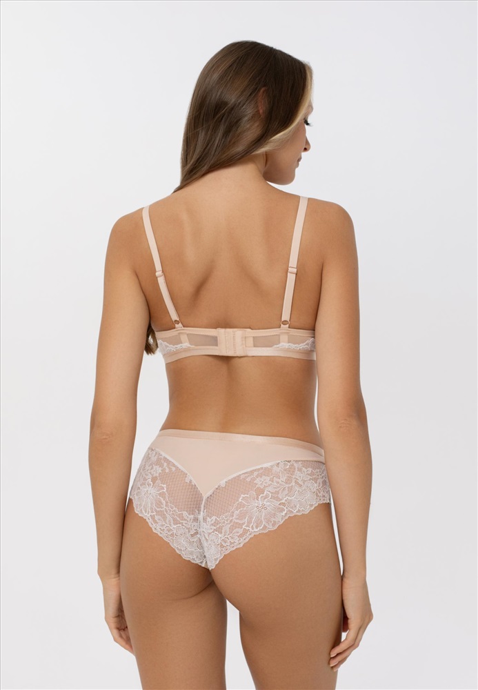 Бюстгальтер с формованной чашкой и встроенными корректорами «пуш-ап» на каркасной поддержке. Кружевной стан на подкладке из сетки.