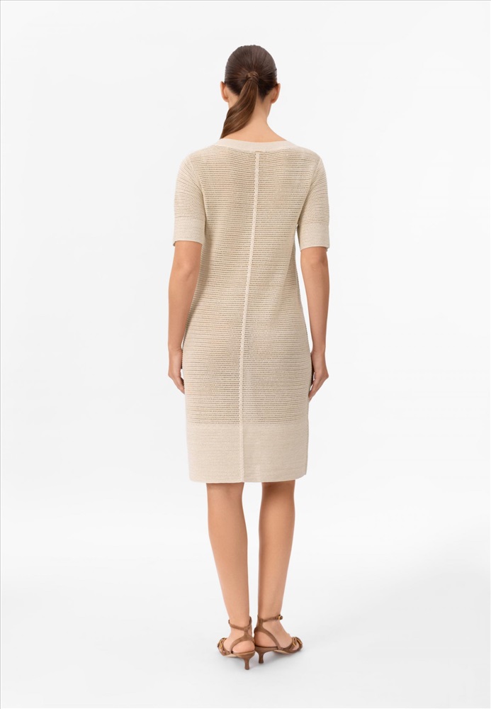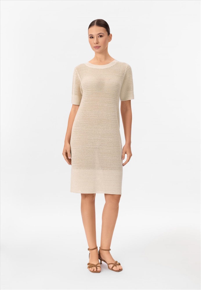 Платье с коротким рукавом из шелка и хлопка. Круглый вырез горловины оформлен вязаной резинкой. Втачной рукав. Длина выше колена. Спинка декорирована вертикальной полосой. Платье выполнено вязкой «кроше» из мягкой пряжи с деликатными вкраплениями тонкой металлизированной нити для лёгкого сияния. Низ изделия и рукавов выполнены плотной вязкой.