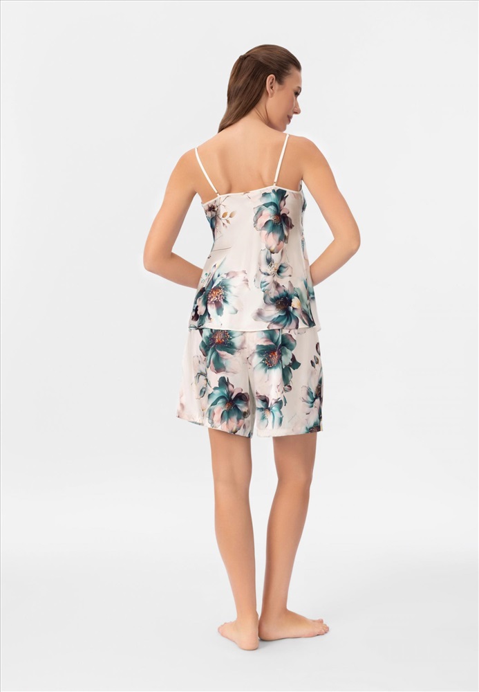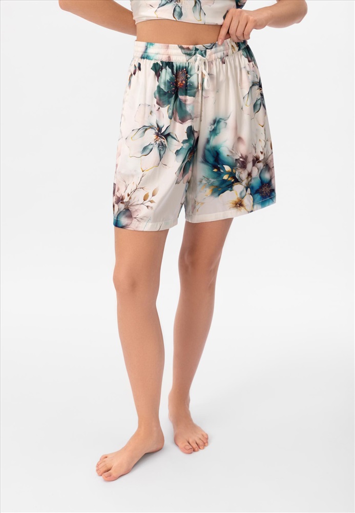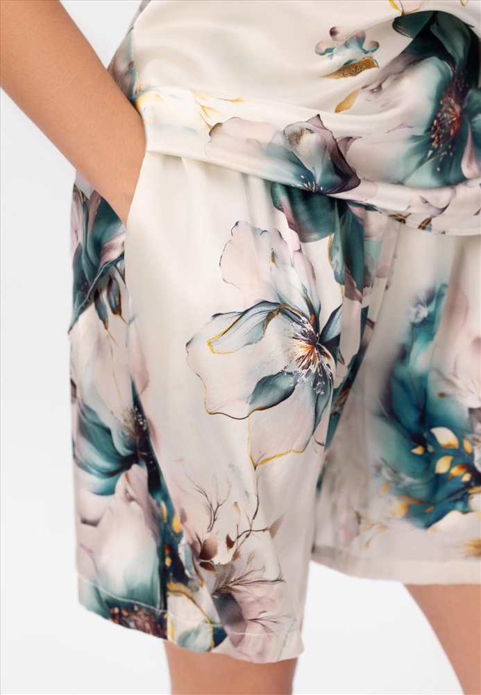 Шорты свободного прямого кроя. Боковые карманы. Пояс на резинке со шнуром. Шорты выполнены вязкой «кроше» из мягкой пряжи на основе шёлка и хлопка с деликатными вкраплениями тонкой металлизированной нити для лёгкого сияния.
