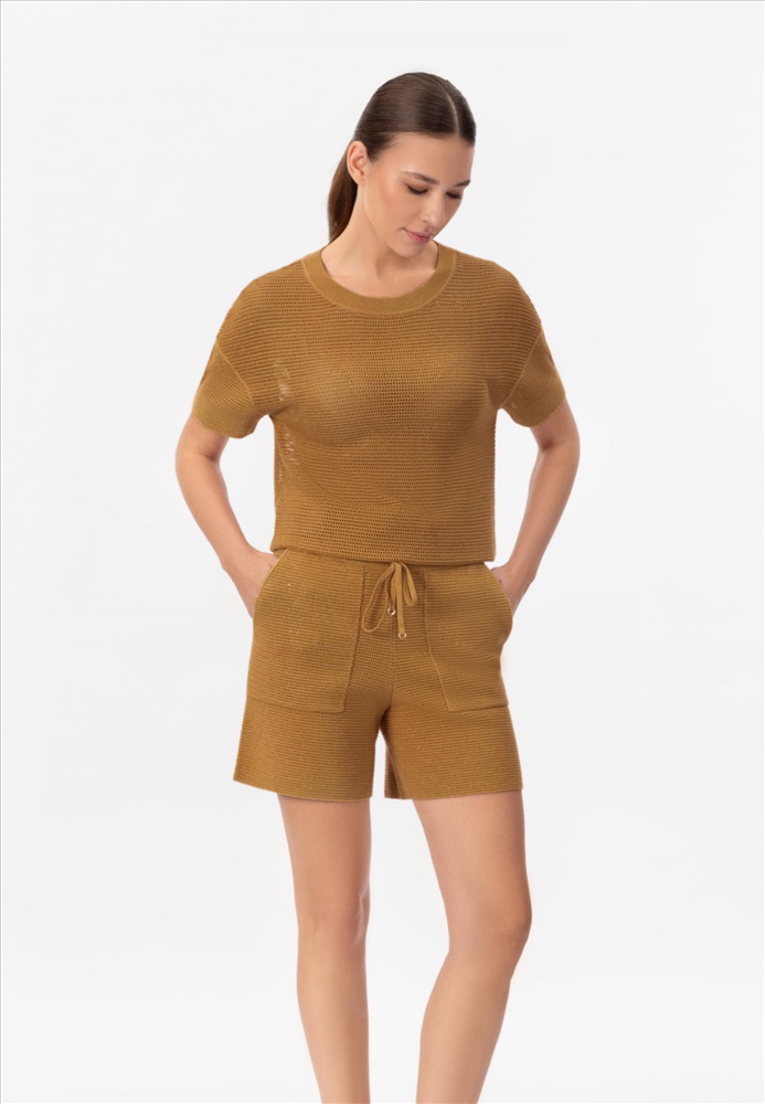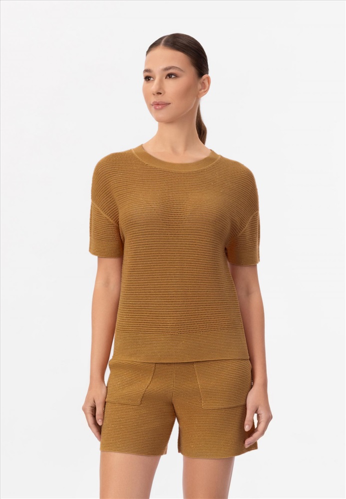 Джемпер с коротким рукавом из шелка и хлопка. Круглый вырез горловины оформлен вязаной резинкой. Спущенная линия плеча. Длина до середины бедра. Джемпер выполнен вязкой «кроше».