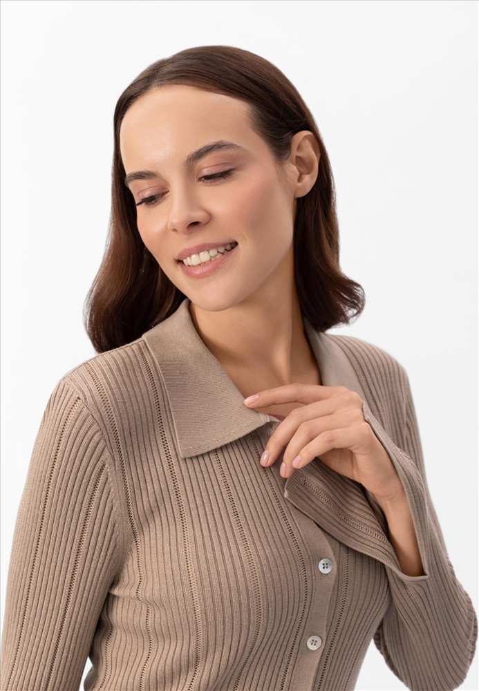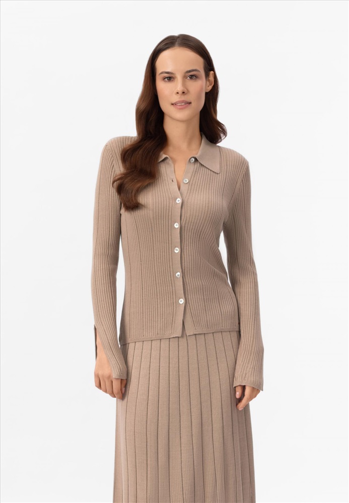 Лёгкий кардиган с длинными рукавами на пуговицах из шелка и вискозы. Полуприлегающий силуэт. Изделие выполнено из трикотажа в рубчик с элементами «пуантель». Отложной воротник.