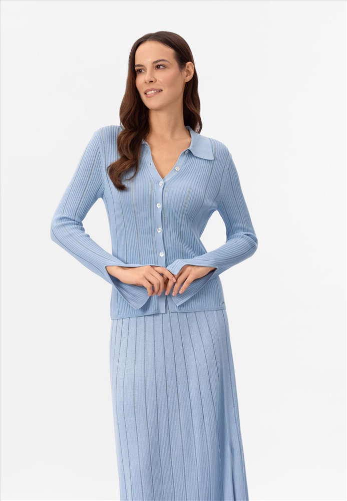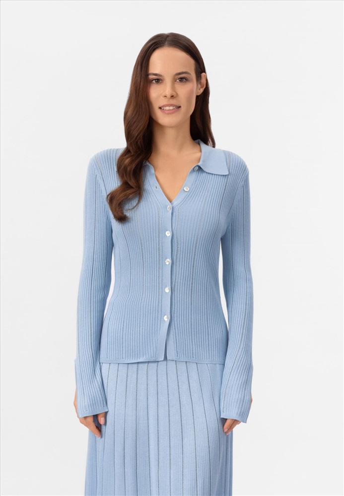 Лёгкий кардиган с длинными рукавами на пуговицах из шелка и вискозы. Полуприлегающий силуэт. Изделие выполнено из трикотажа в рубчик с элементами «пуантель». Отложной воротник.