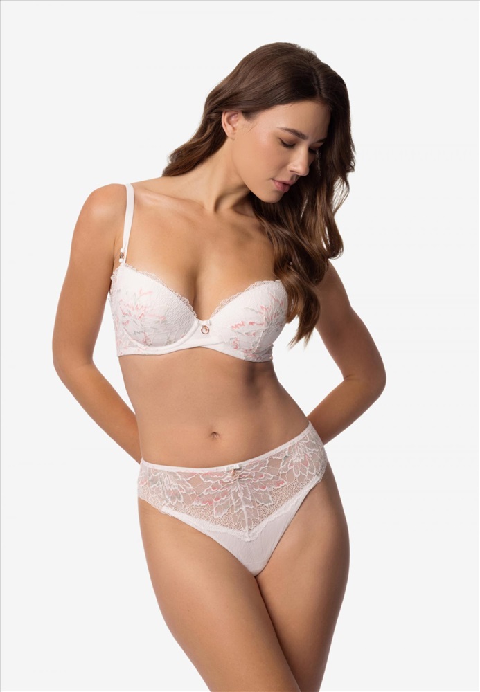 Бюстгальтер с формованной чашкой и съемными корректорами «пуш-ап» на каркасной поддержке. Внутренняя часть чашки дублирована хлопком. Перекрест деталей из сетки и кружева на боковой панели. Круглая спинка. Бретели украшены аксессуаром.
