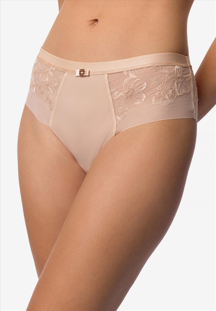 Трусы-бразилиана со средней линией талии. Пояс выполнен из эластичной тесьмы. Передняя деталь из гладкой микрофибры и сетки с вышивкой. Задняя деталь из эластичной сетки с вышивкой.