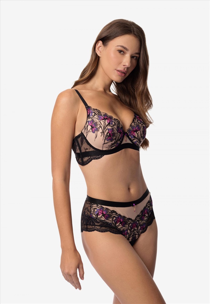 Бюстгальтер с формованной чашкой и встроенными корректорами «пуш-ап». Каркасная поддержка. Чашки декорированы вышивкой. Удлиненный стан из мягкого кружева дублирован сеткой. Боковые косточки.