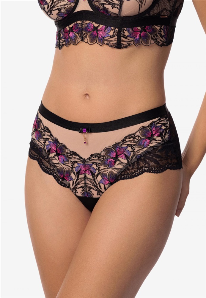 Трусы-хипстеры со средней линией талии. Передняя деталь: сочетание кружева и сетки с вышивкой. Задняя деталь из сетки и кружева с ажурными краями.