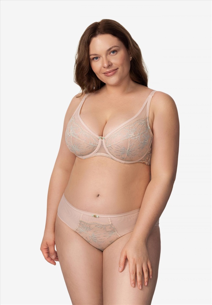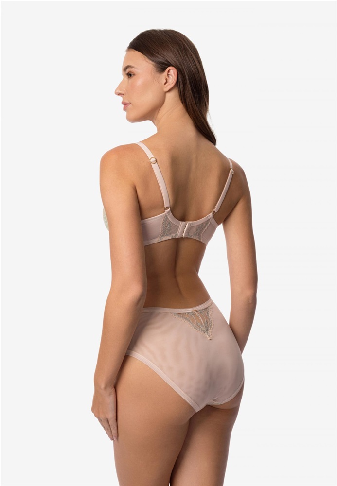 Бюстгальтер с мягкой чашкой на каркасной поддержке. Внутренняя поверхность чашки дублирована эластичной сеткой. С внешней стороны чашки украшены кружевом. Стан из кружева на подкладке из сетки. Круглая спинка. Боковые поддерживающие косточки.