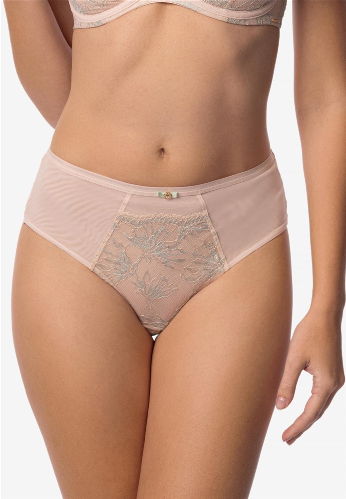 Трусы-брифы со средней линией талии. Пояс выполнен из эластичной тесьмы. Передняя деталь: сочетание кружева и эластичной сетки. Задняя деталь из двойной сетки со вставкой из кружева.