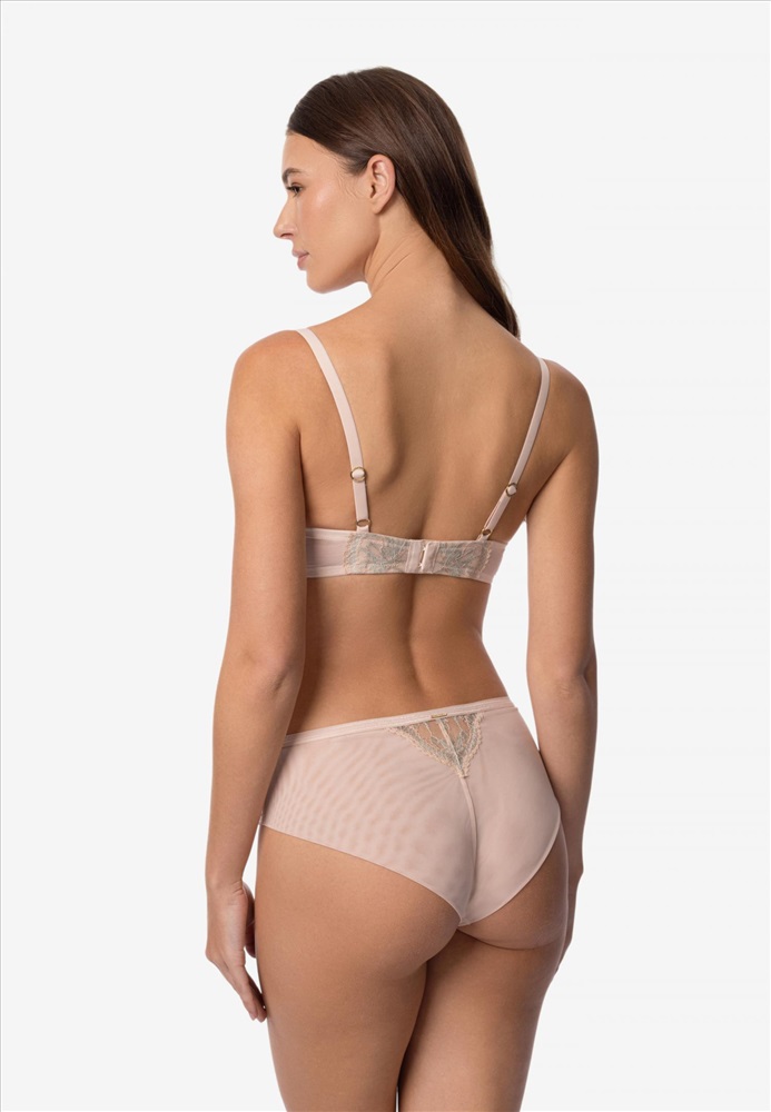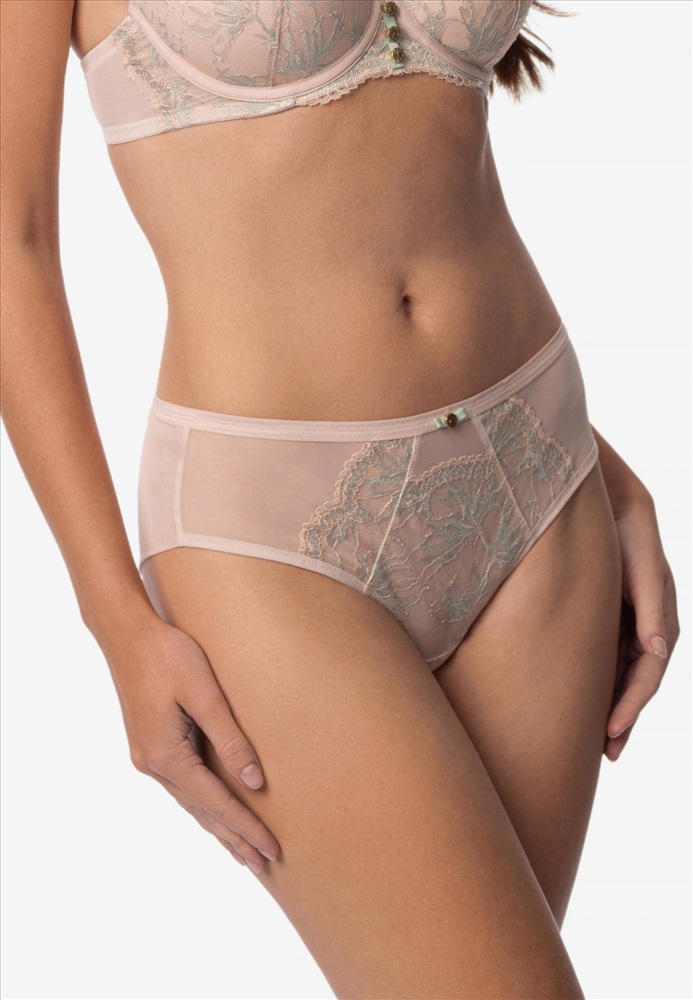 Трусы-бразилиана со средней линией талии. Передняя деталь из кружева на подкладке из сетки. Задняя деталь из двойной сетки в подворот с кружевной вставкой