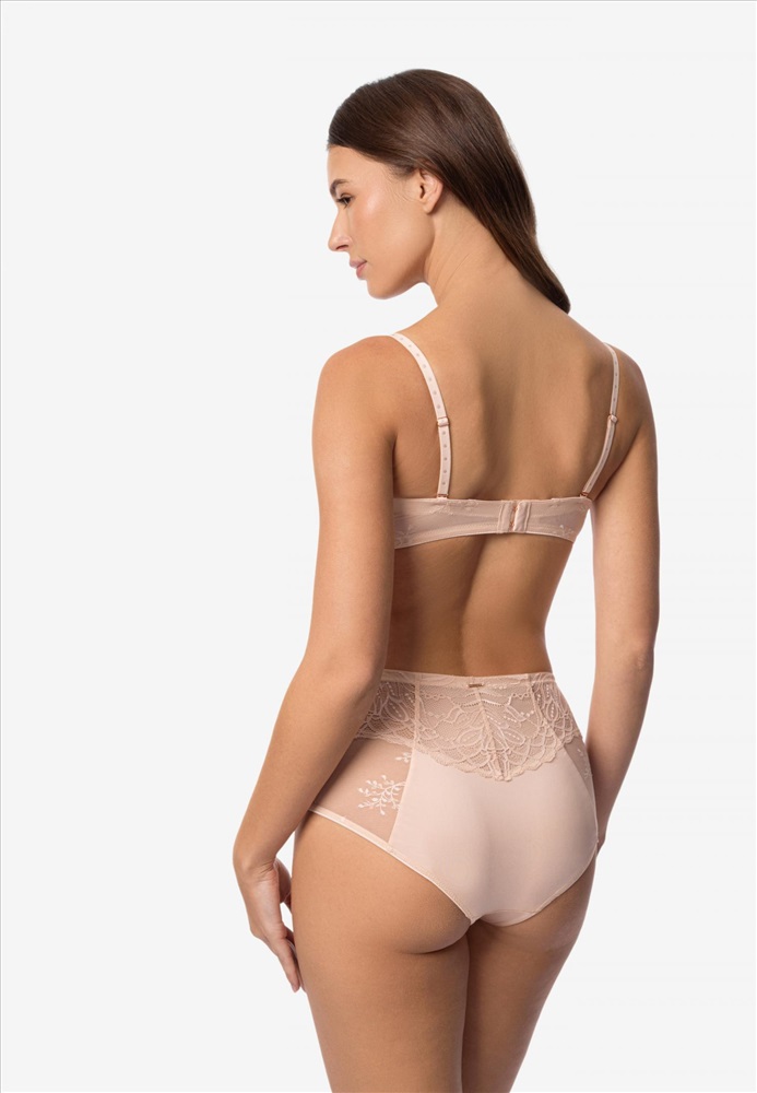 Бескаркасный бюстгальтер-балконет со встроенным «пуш-ап». Эффект «скрытого каркаса». Уплотненный стан для комфортной поддержки. По верхнему и нижнему краю боковых деталей силиконовая лента. Стан выполнен из двойной сетки. Съемные бретели. Дополнительные силиконовые бретели в комплекте.