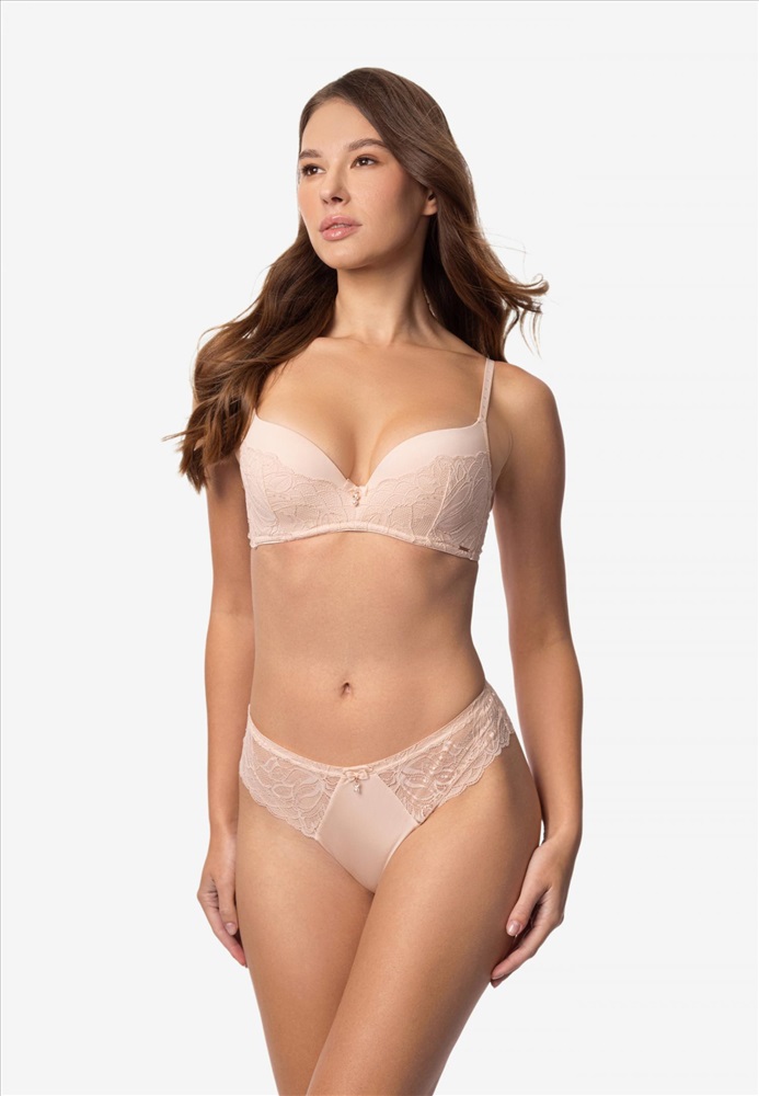 Бюстгальтер с формованной чашкой и встроенным «тройным пуш-ап». Каркасная поддержка. Визуальное увеличение груди на два размера. Отделка с эффектом «скрытого каркаса». Чашки с внешней стороны декорированы кружевом. Круглая спинка. Боковые поддерживающие косточки.