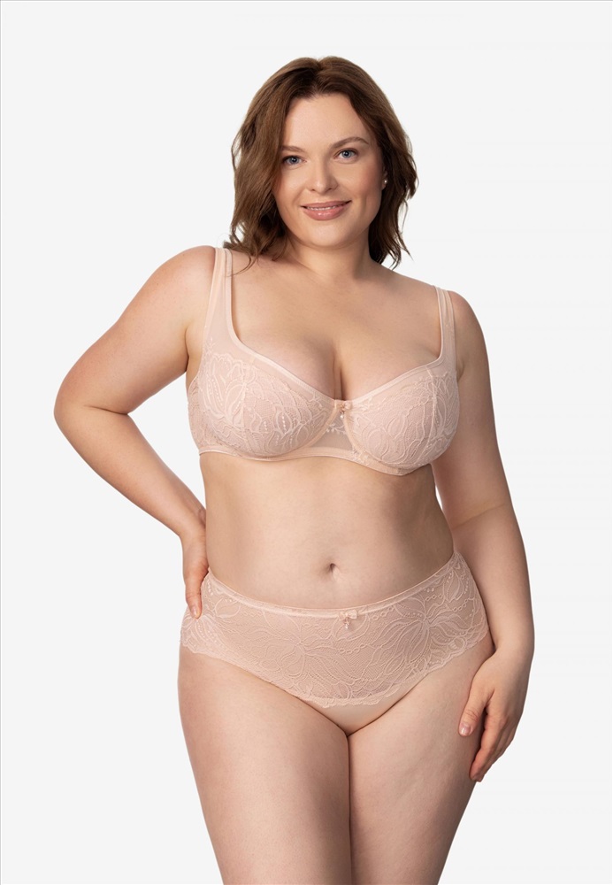 Бюстгальтер с мягкой чашкой на каркасной поддержке. Чашки декорированы кружевом. Внутренняя поверхность выполнена из эластичной сетки. Расширенные бретели из двойной сетки. Комбинированный стан на подкладке из сетки. Круглая спинка.