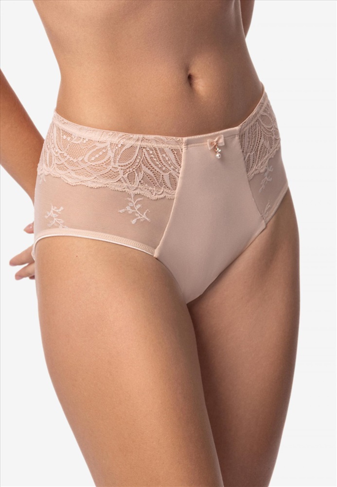 Трусы-брифы со средней линией талии. Передняя деталь: сочетание кружева, сетки и микрофибры. Задняя деталь из микрофибры со вставкой из кружева.