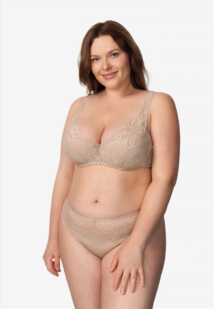 Бюстгальтер с полудублированной шитой поролоновой чашкой на каркасной поддержке. Чашка с внутренней стороны дублирована хлопком. С лицевой стороны чашка декорирована кружевом. Кружевной стан на подкладке из сетки. Широкие бретели из сетки декорированы кружевом с ажурными краями.
