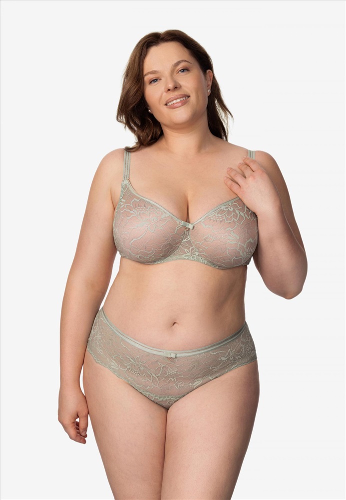 Бюстгальтер с мягкой молдированной чашкой на каркасной поддержке. Внутренняя поверхность чашки дублирована эластичной микрофиброй. Бретели отстегиваются спереди. Верхний край чашек по линии декольте декорирован золотой нитью. Кружевной стан на подкладке из сетки. Круглая спинка.