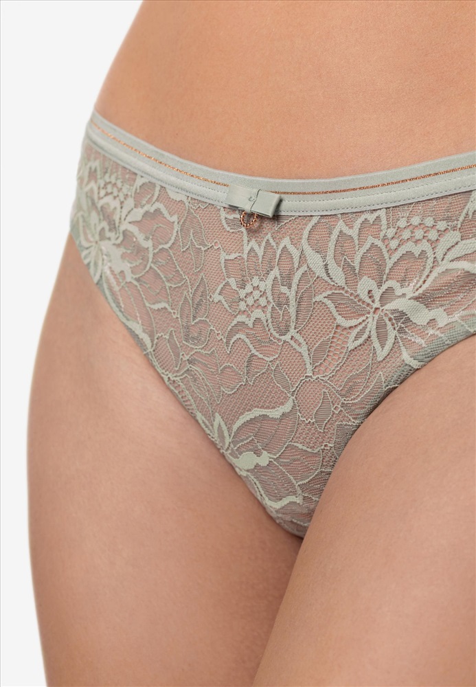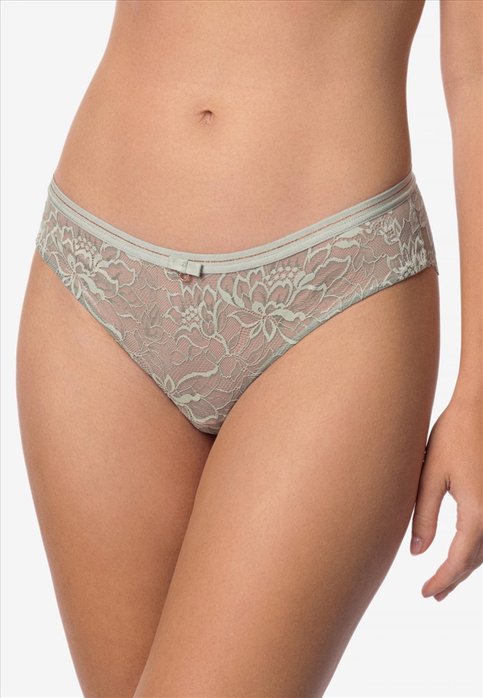 Трусы-бразилиана со средней линией талии. Пояс из эластичной тесьмы декорирован золотой нитью. Передняя деталь из кружева на подкладке из сетки. Задняя деталь из кружева с ажурными краями.