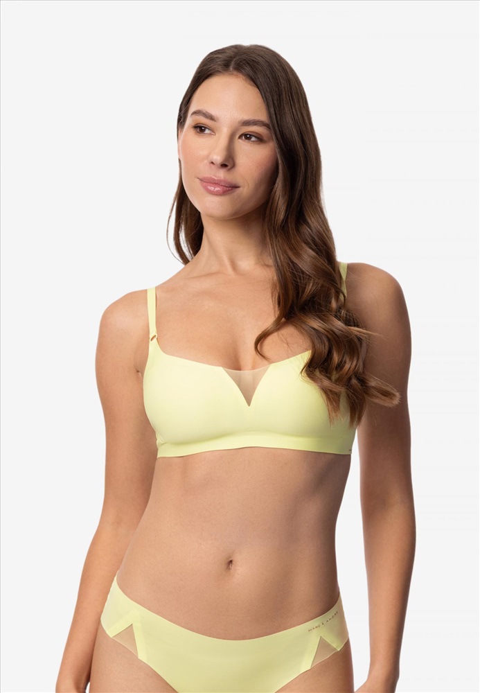 Бесшовный бескаркасный тонкий бюстгальтер. Ощущение абсолютного комфорта. Тонкие съемные корректоры. Спереди между чашек декоративная вставка из сетки. Бюстгальтер выполнен из одной цельной детали. Технология «Sewfree».