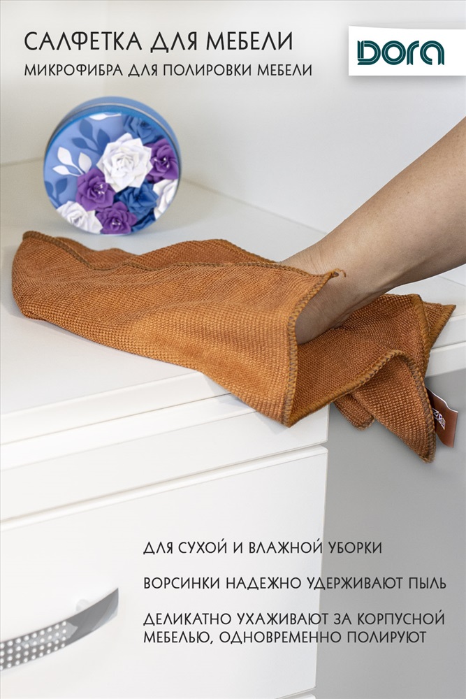 Состав: полиэстер 80%, полиамид 20% Модель: Салфетка Для мебели и бытовой техники Dora30х30 см из микрофибры арт.2001-005 Тип товара: салфетка хозяйственная Материал: микрофибра | микрофибра Бренд: DORA Назначение: для дома Сезонность: лето | осень | весна | зима Стиль: домашний 1. Уникальная текстура 3М состоит из маленьких бугорков-точек, которые очищают и полируют мебельные поверхности (дерево, мдф, пластик и т.п). 2. В составе полиамид - салфетка обладает высокими впитывающими свойствами, вытирает насухо и без разводов. 3. Ткань высокой плотности - длительный срок эксплуатации. 4. Двойной оверлок, усиление в виде вискозной ленты (между тканью и оверлоком) - салфетка не деформируется и край не крошится при интенсивном использовании и многократных стирках. 5. Салфетка не линяет, не выцветает 6. Оптимальный размер -удобно держать в руке, мыть, выполаскивать 7. Выдерживает около 1000 циклов машинной стирки (при t 40-60С), быстро сохнет. Плотность 220 гр./м2, Таблица размеров и веса