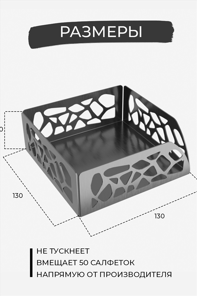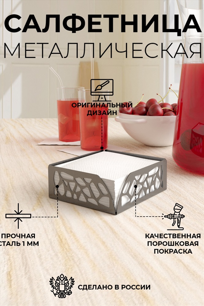 Назначение: для кухни Салфетница металлическая из качественной прочной стали 1 мм. с оригинальным дизайном и порошковым покрытием подойдет как на праздничный стол, так и на повседневный! Отличный подарок на новый год, новоселье. Производство Россия.