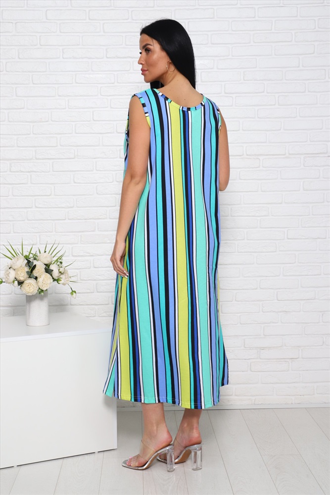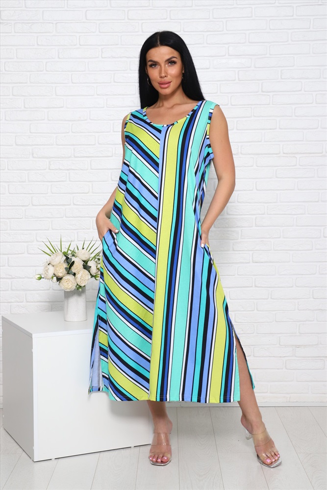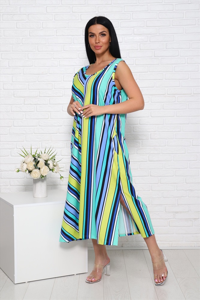 Застежка: без застежки Сарафан женский, выполнен из трикотажного полотна кулирка. Сарафан свободного силуэта, ниже колен. Горловина и проймы окантованы. По бокам низа сарафана имеются разрезы.