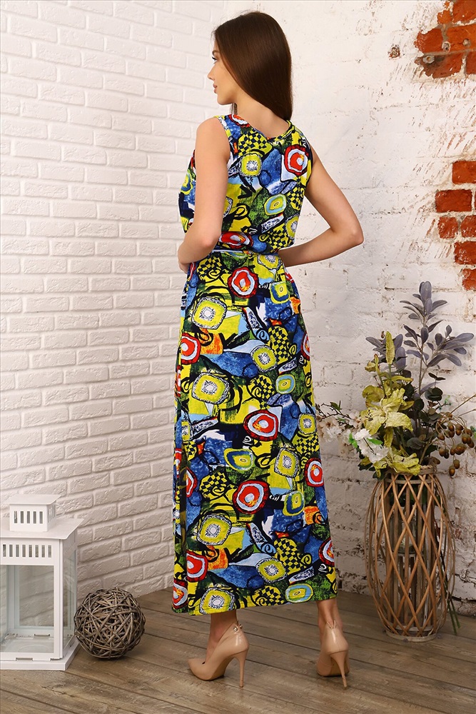 Страна производства: Россия Сарафан женский из набивного кулирного полотна: прямое, длинное, горловина круглая, отрезная полочка, по талии пояс, в боковых швах разрезы, низ изделия обработан на плоскошовной машине.