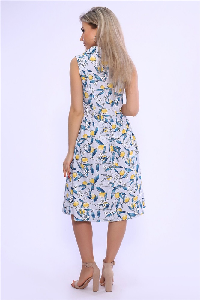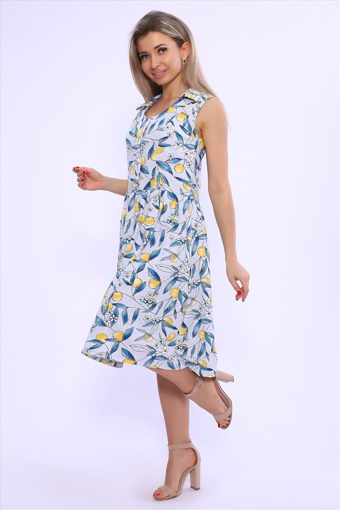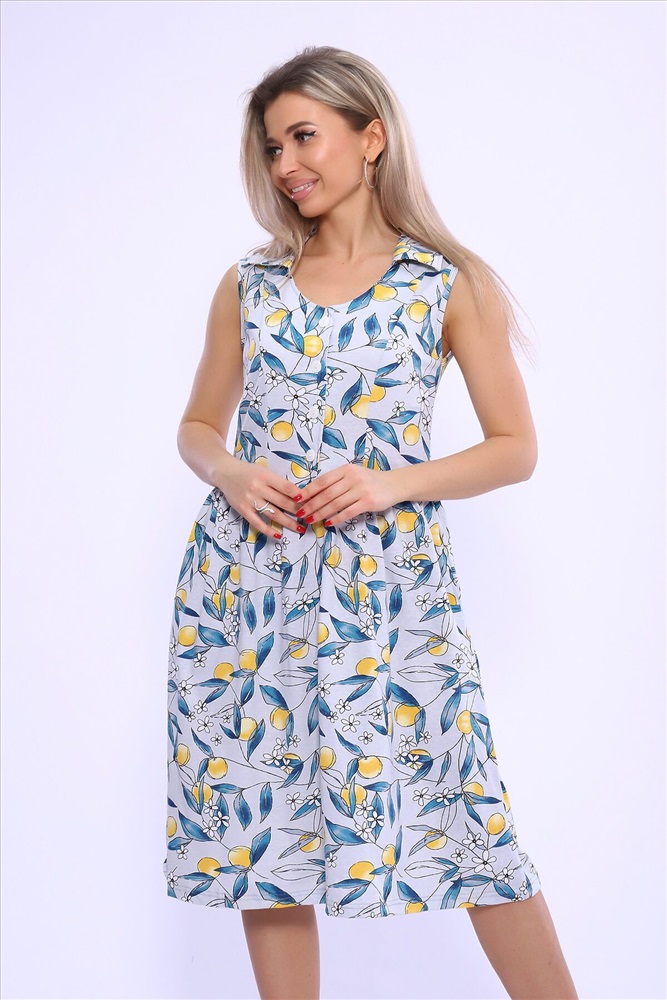 ID товара: 982343 Состав: 100% Хлопок Сезон: Весна/Лето Длина: Ниже колена Фасон: Расклешенное Рукав: без рукавов Вид застежки: Пуговицы Вырез горловины: Отложной воротничок Рисунок: растительный Тип карманов: В шве Декоративные элементы: Принт Основная ткань: Хлопок Стиль: повседневный Вид ткани: Кулирка Страна бренда: Россия Страна производства: Россия Сарафан на широких бретелях с воротником и юбкой на сборке. Полочка на пуговицах. Карманы в боковых швах. Комментарии к товару