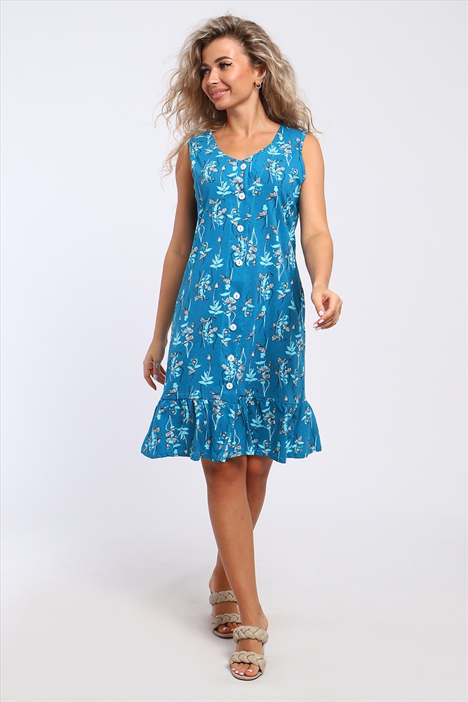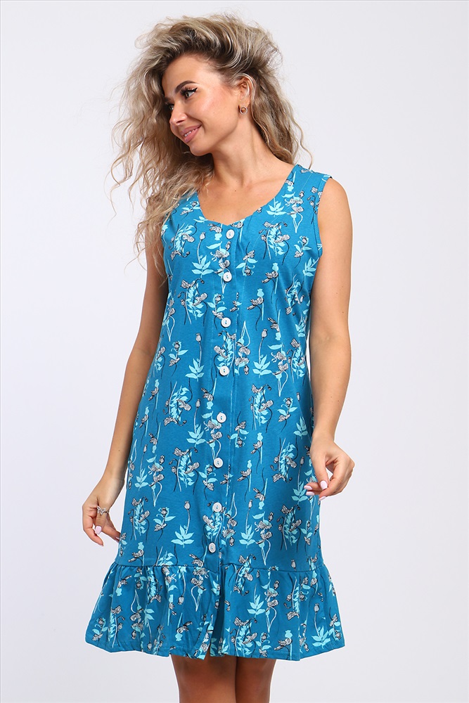 Застежка: без застежки Сарафан на пуговицах полуприлегающего силуэта и V - образным вырезом горловины. По низу изделия волан на сборке. Карманы в боковых швах.