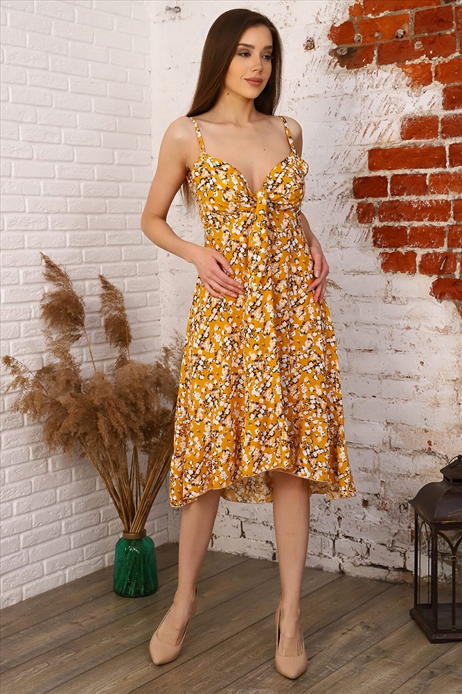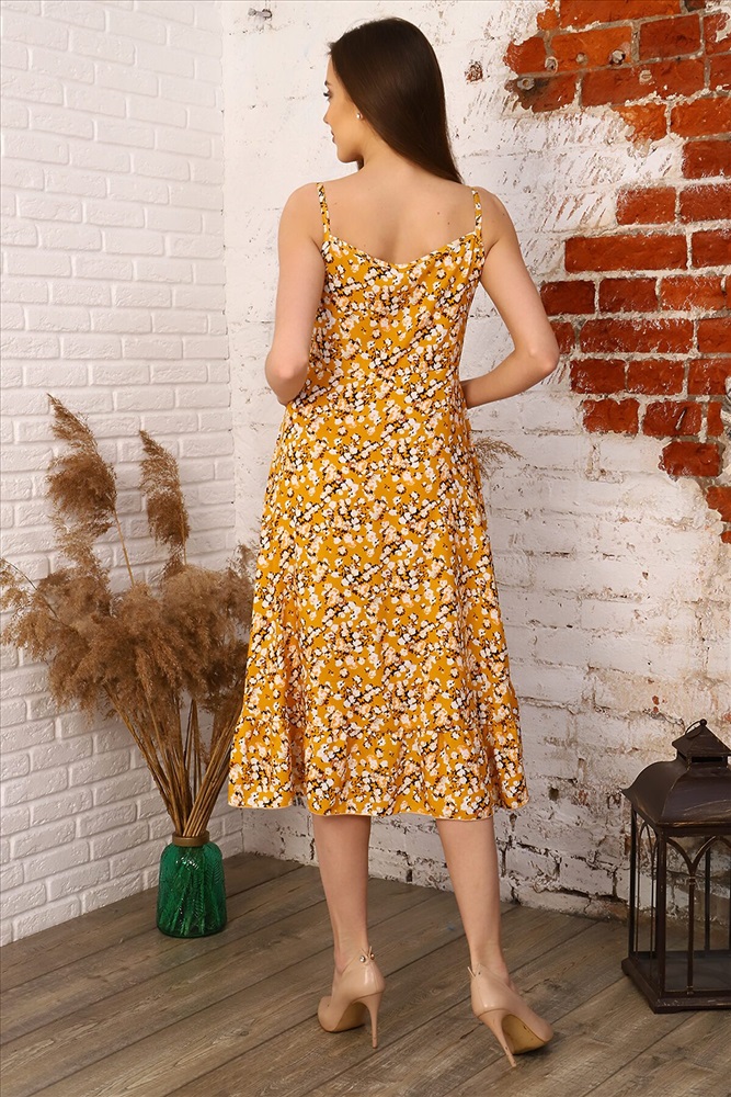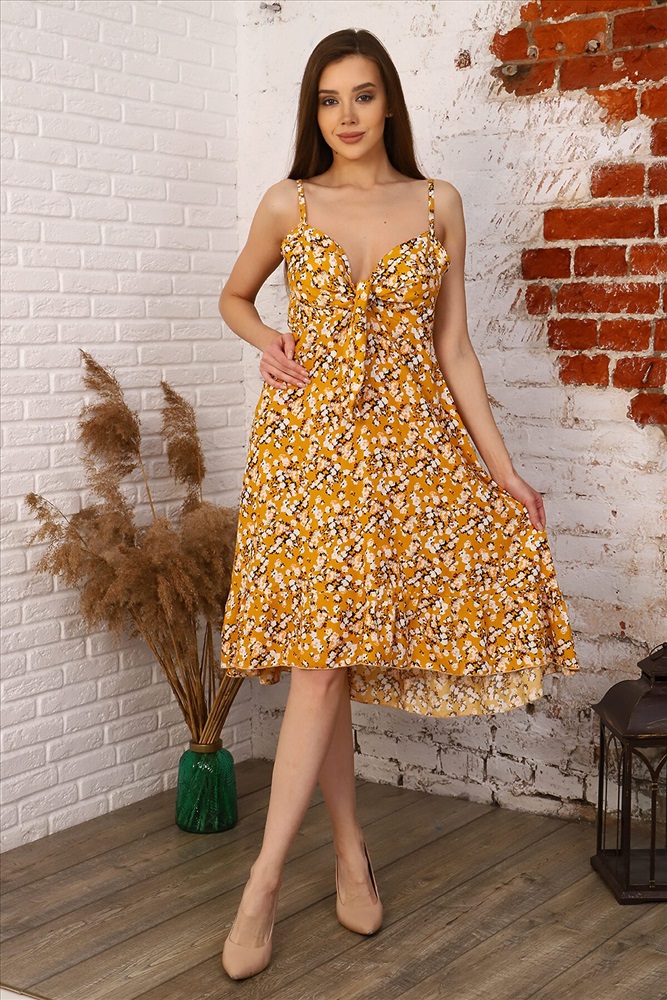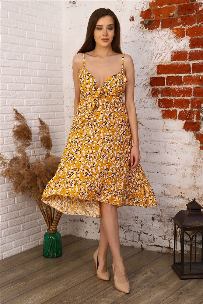ID товара: 882564 Состав: 100% Вискоза Сезон: Весна/Лето Длина: Миди Фасон: Свободный крой Вырез горловины: Декольте Рисунок: цветочный Основная ткань: Штапель Стиль: Повседневный Страна бренда: Россия Страна производства: Россия Летний сарафан из легкого летящего штапеля. Сарафан свободного кроя, спереди короткий, сзади плавно удлиняется. Оборка по низу. Декольте украшено необычными завязками в виде банта, на бретелях. Яркий солнечный принт Комментарии к товару