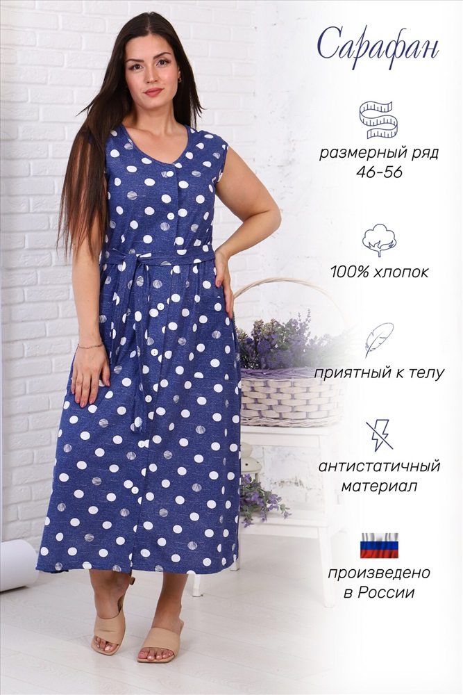 ID товара: 877216 Состав: 100% Хлопок Сезон: Демисезон Длина: Средняя Фасон: Прямой Рукав: Без рукава Вырез горловины: V-образный Рисунок: Горох Основная ткань: Кулирка Стиль: Повседневный Страна бренда: Россия Страна производства: Россия Сарафан женский на пуговицах из набивного кулирного полотна. Изделие легкое в уходе. Благодаря натуральному составу ткань позволяет вашей коже дышать. Сарафан прекрасно подойдет для дома, дачи, прогулок и отдыха. Комментарии к товару